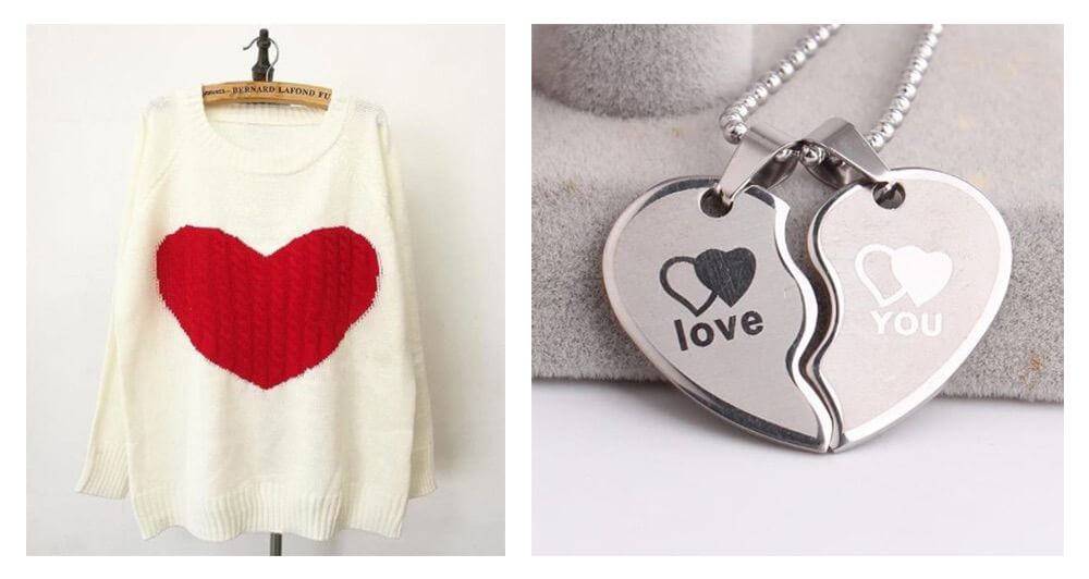 Свитер с сердечками, футболка с вашим общим фото, парный кулон-подвеска из двух половинок.