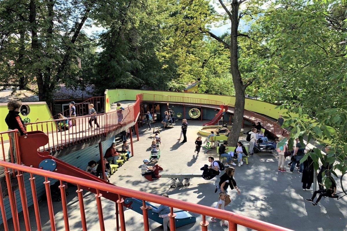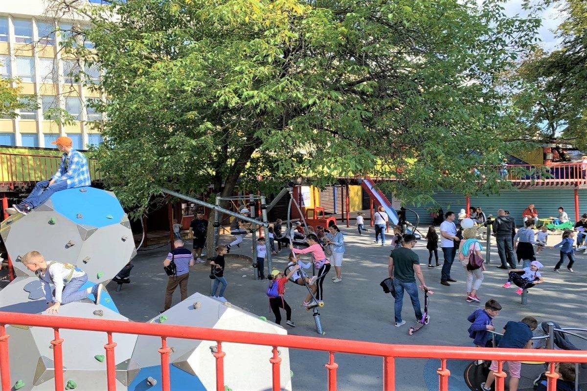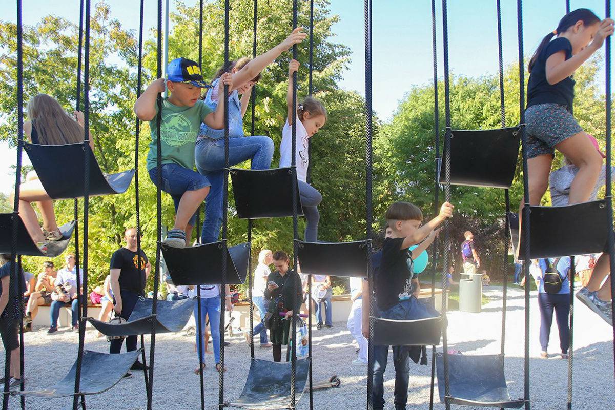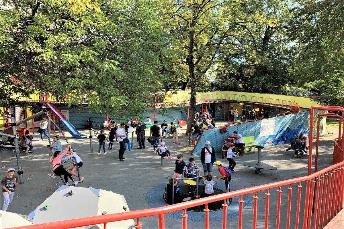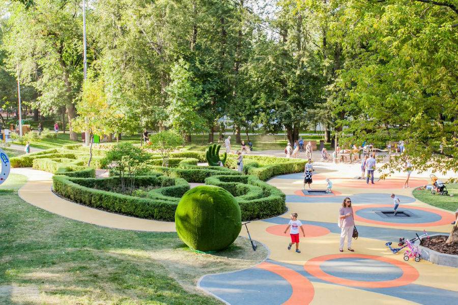По площади, которую занимают детские площадки в соотношении с другой инфраструктурой, с Делегатским парком соперничать сложно. На 4 гектарах здесь сосредоточились 5 игровых комплексов – «Песочная фабрика» для самых маленьких и 4 площадки по названиям планет: «Луна», «Нептун», «Марс» и «Меркурий». Среди развлечений – «лазалки», батуты, скалодром, большие горки и живой лабиринт, а одним из самых заманчивых аттракционов парка для посетителей стали две тарзанки – длинная и короткая (на ней разгон происходит еще быстрее). Не дадут заскучать и взрослым – если ваш вес меньше 80 килограммов, вы сможете присоединиться к своему чаду и так же попробовать все увеселения парка.