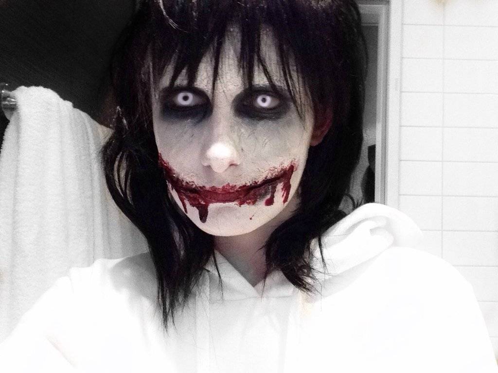 Страшный грим на праздник Хэллоуин с Джеффом убийцей, уже многие воплощали в жизнь. Его отличительная черта – выпученные глаза. Это достигается при помощи нанесения под нижние веки небольшого количества клея. Когда он подсохнет, нанесите латексную основу на лицо, оставляя свободными области вокруг глаз.