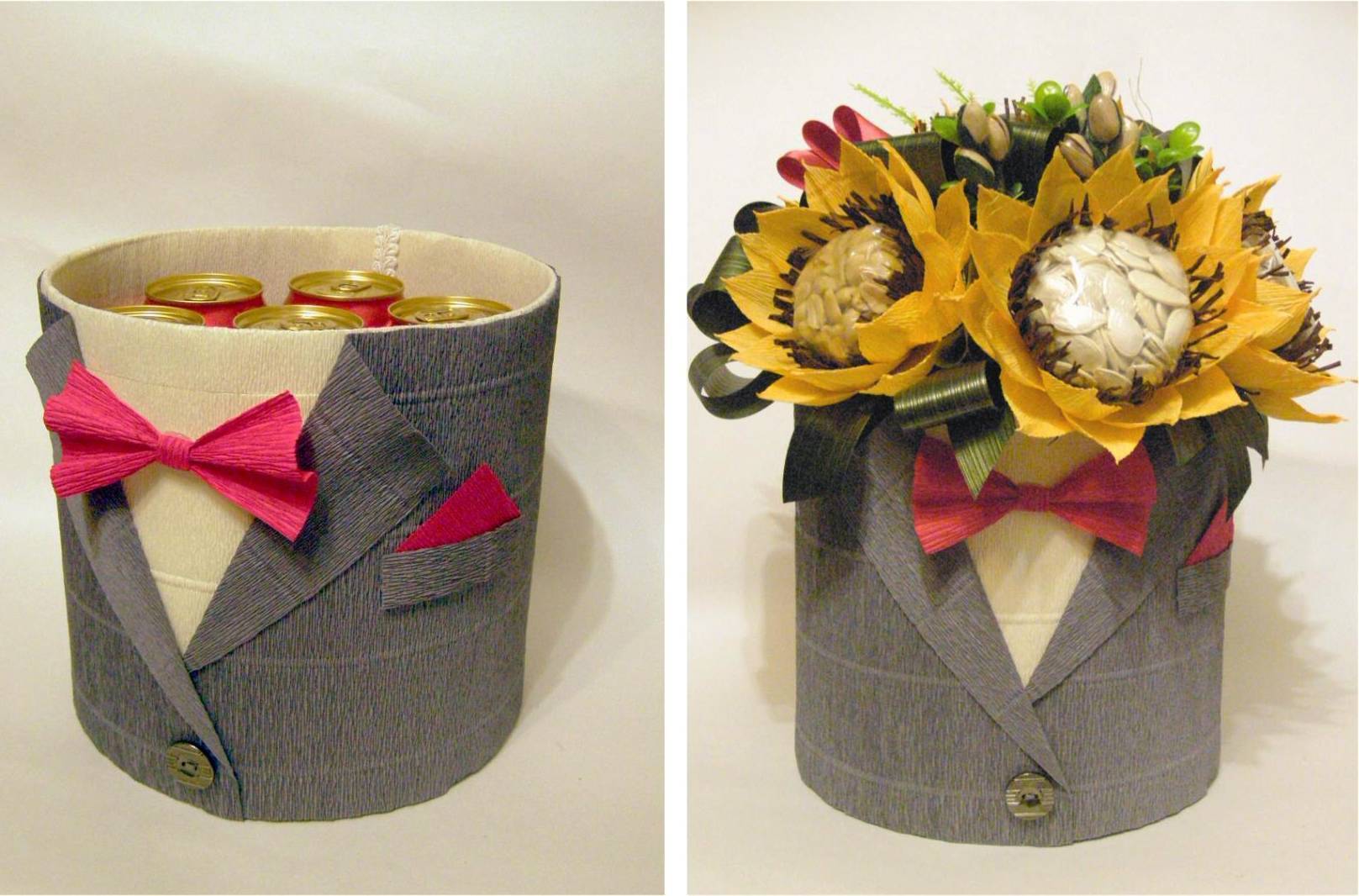 По центру букета можно поместить банку или бутылку хорошего пива, коньяка или другого напитка, который будет предпочтительнее для получателя подарка.