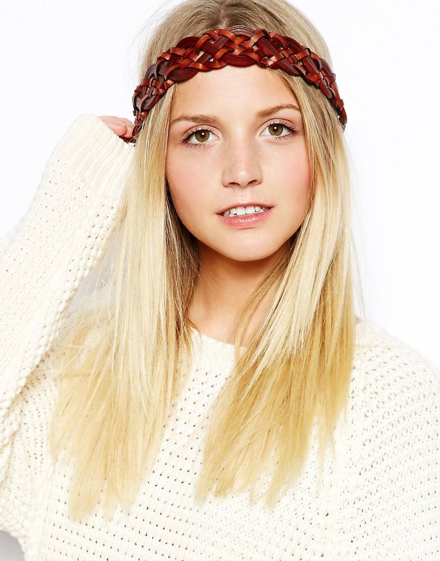 Есть модницы, которые предпочитают вплетать повязку в косу. Делают это очень просто: волосы убирают набок, оборачивают изделие вокруг головы, после чего начинают обычное плетение. Как вариант можно заплести две косички, а концы зафиксировать заколками в области затылка. Вариант с косой выглядит всегда стильно и модно.