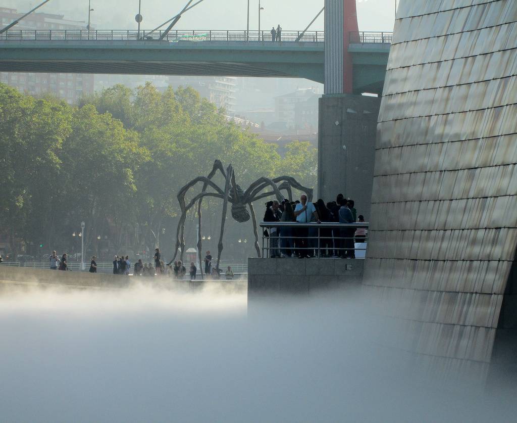 Теперь подробнее остановимся на экспонатах музея Гуггенхайма, которые славятся на весь мир. Например, если посмотреть на здание со стороны реки, то можно заметить мостик, изогнутый дугой. По нему можно прогуляться, чтобы осмотреть здание музея. Так, вы подойдете практически вплотную к металлической скульптуре паука огромных размеров с длинными и мощными конечностями, который словно окутан туманом. Необыкновенно жуткое зрелище, похожее на кадр из фильма ужасов.