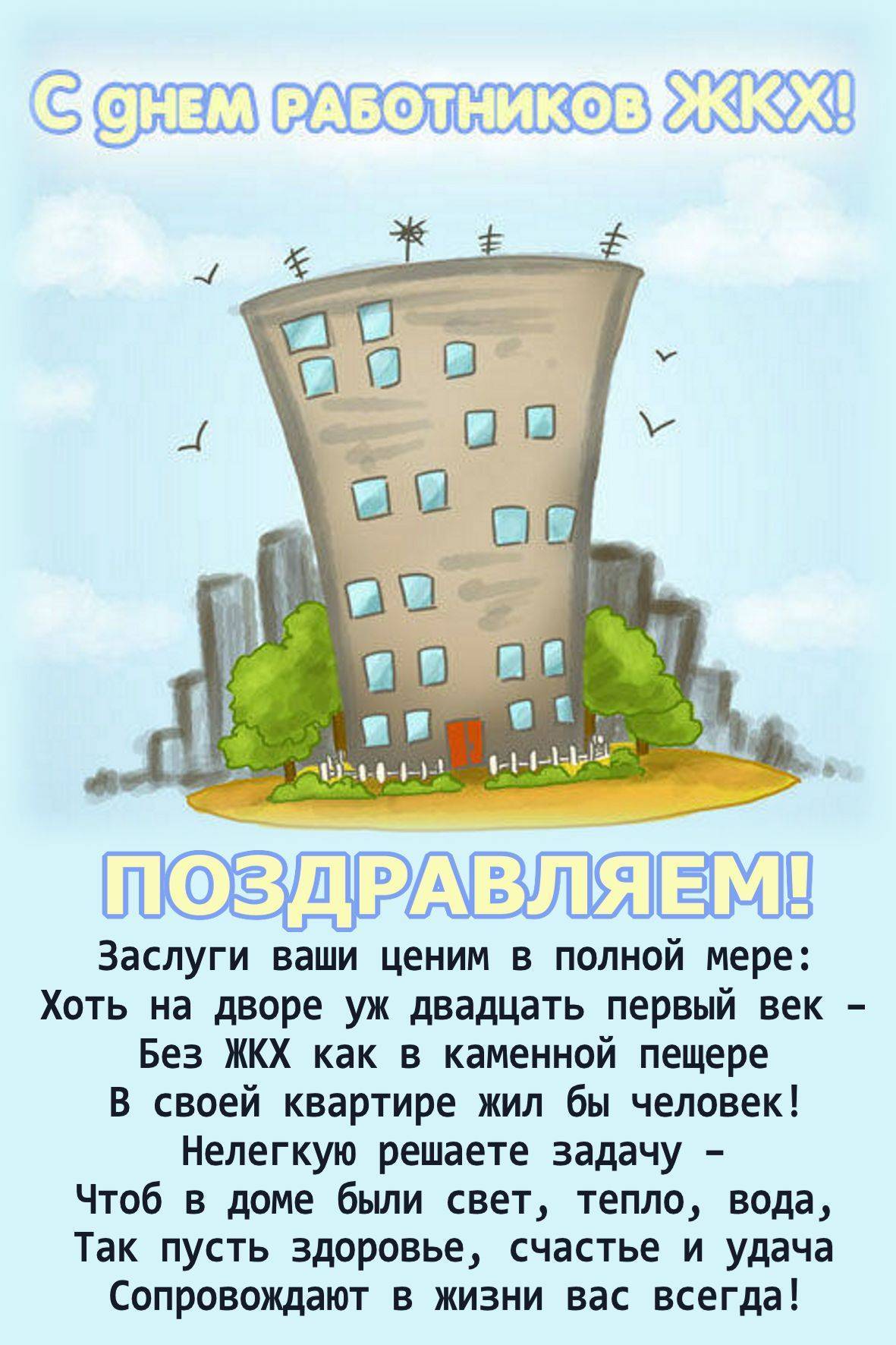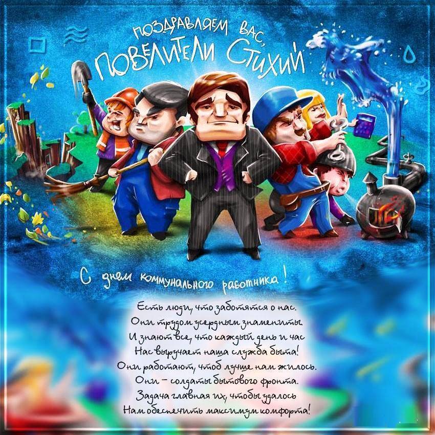 Жилищно-коммунальное хозяйство, На вас заданий множество лежит, Пусть будет чуждо вовсе разгильдяйство, Пускай работа радость подарит. Желаем вам удачи и успеха, Пускай веселье льется через край, А если плакать – только лишь от смеха, Ни горя, ни печалей не узнай!
