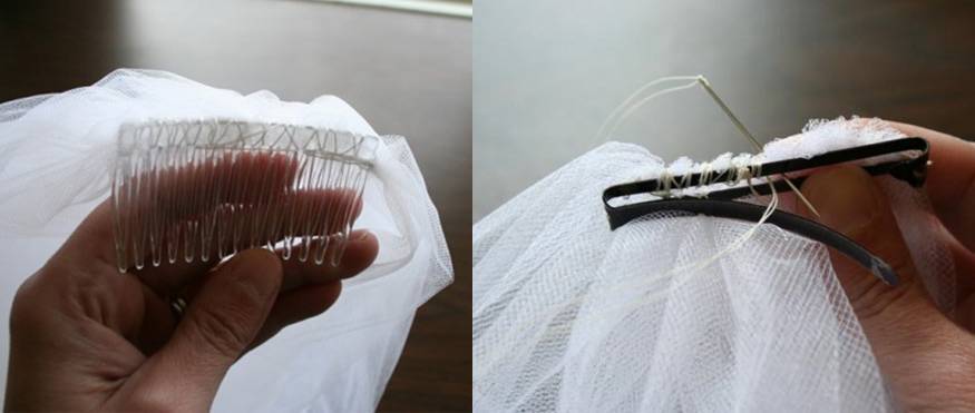 Пришейте к фате заколку, с помощью которой вы прикрепите фату к волосам:
