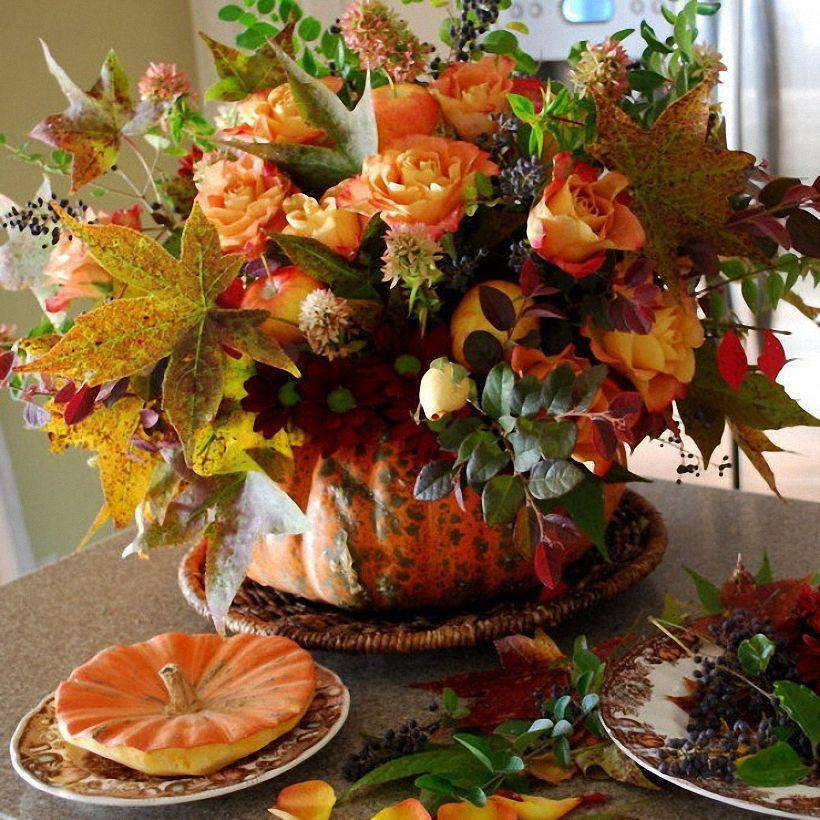 Берем небольшую тыковку. У нее отрезаем дно для устойчивости и делаем сверху дырку, удалив при этом всю мякоть. Затем к высушенной ветке крепим шишки, а ее в свою очередь – в отверстие. Остается украсить плодами рябины на свое усмотрение и осенними листочками.