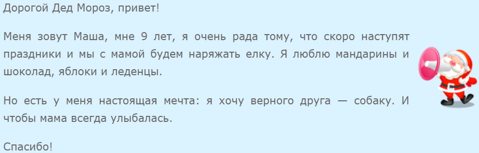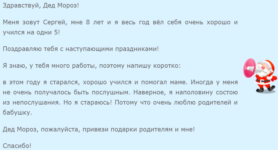 Меня зовут Ваня, мне 7 лет. Я очень хочу стать космонавтом и изучать космос. Пожалуйста, подари мне телескоп, чтобы я мог наблюдать за звездами. Я старался вести себя хорошо весь год, помогать маме и папе, прилежно учиться. Надеюсь, ты существуешь и придешь к нам домой с подарками. С наступающим Новым Годом!