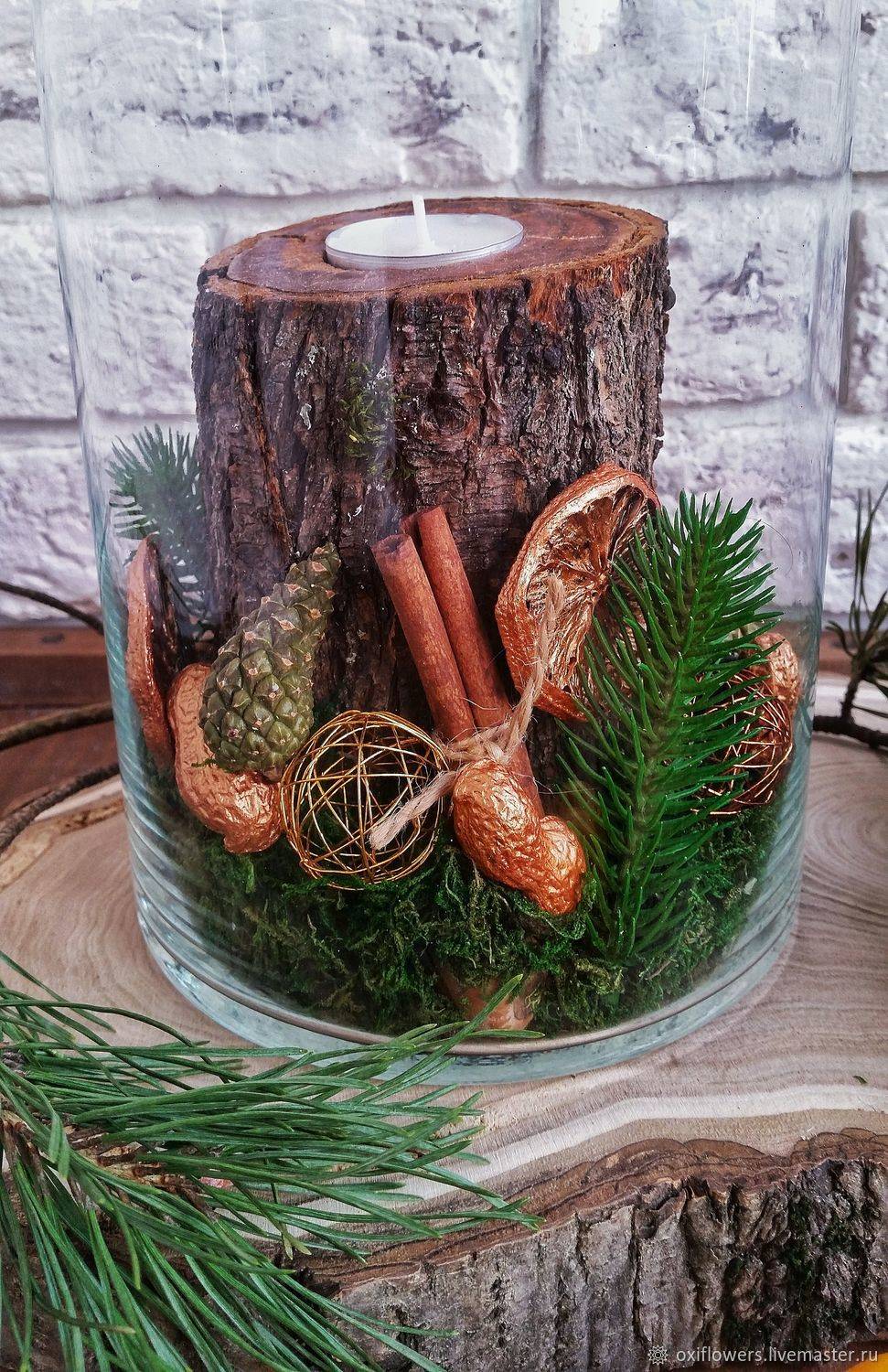 Красивые подсвечники на новый год получаются, если обычные с виду емкости задекорировать природными материалами: веточки с ягодами, кора дерева, шишки, мох. Можно в качестве подсвечника использовать даже целое полено.
