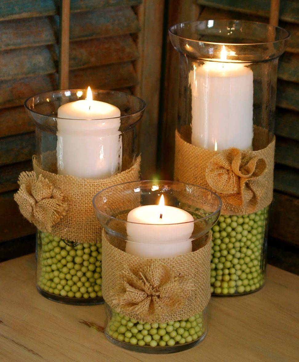 Такой материал, как мешковина, очень часто используется в декоре свечек. С ее помощью можно создать целые композиции, которые смотрятся потрясающе красиво.
