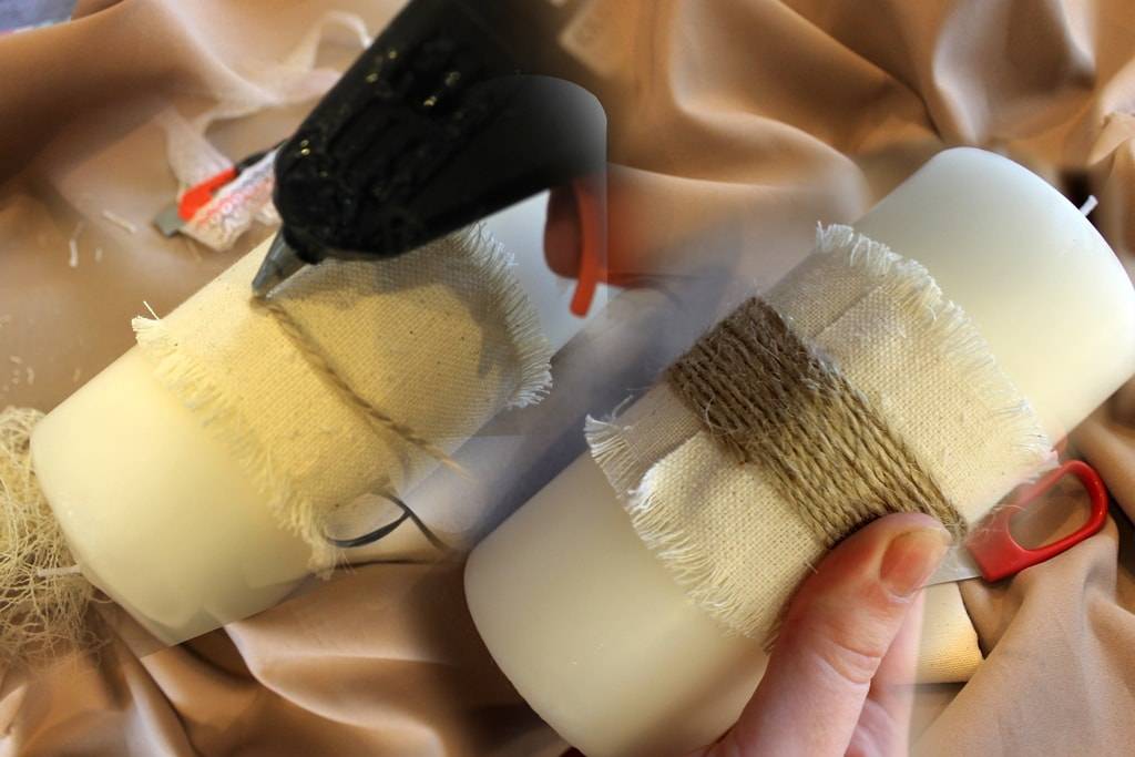 Плотно приматываем мешковину к свече при помощи шпагата. Конец шнура приклеиваем к материалу.