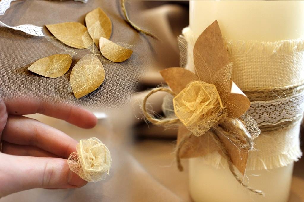 Вырезаем из крафт бумаги листья, чуть больше, чем заготовленные. Делаем из шпагата небольшой бантик, соединяем декор и приклеиваем к свече.