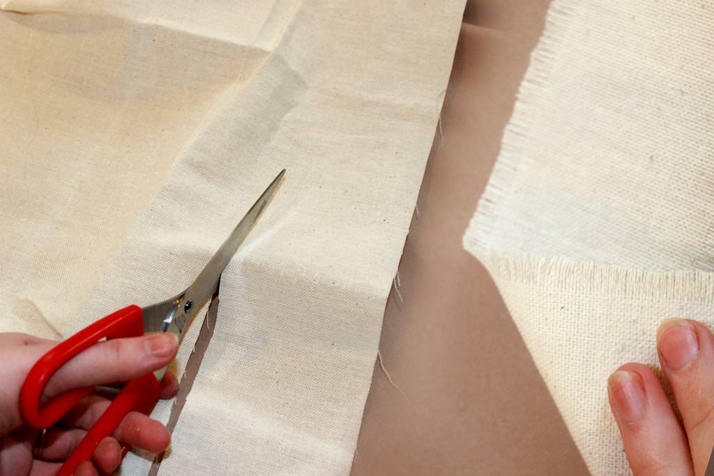Отрезаем кусок мешковины необходимого размера. Распускаем верхнюю и нижнюю часть ткани, чтобы сделать бахрому.