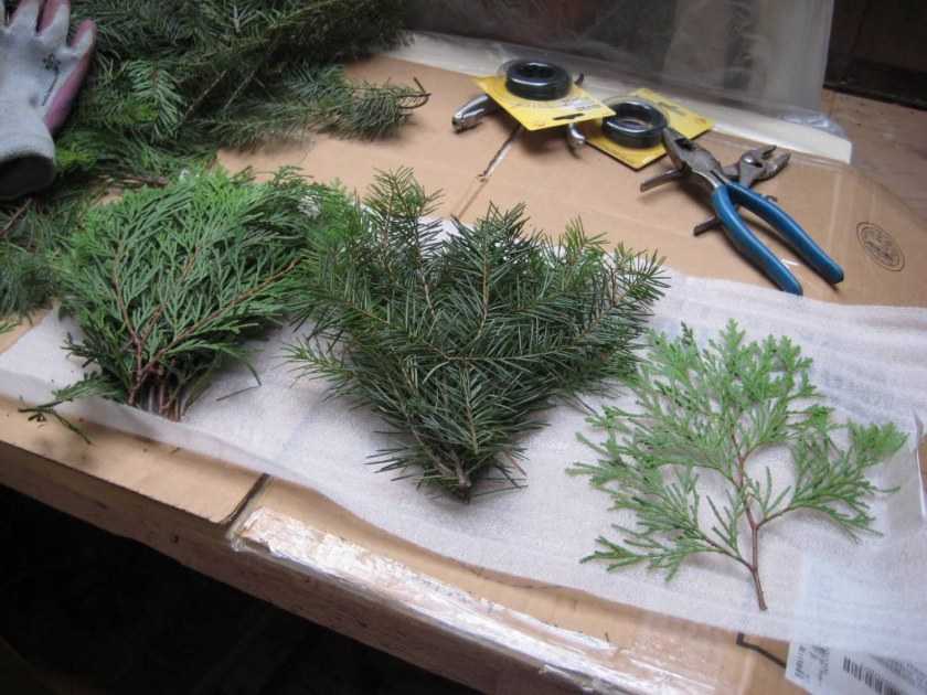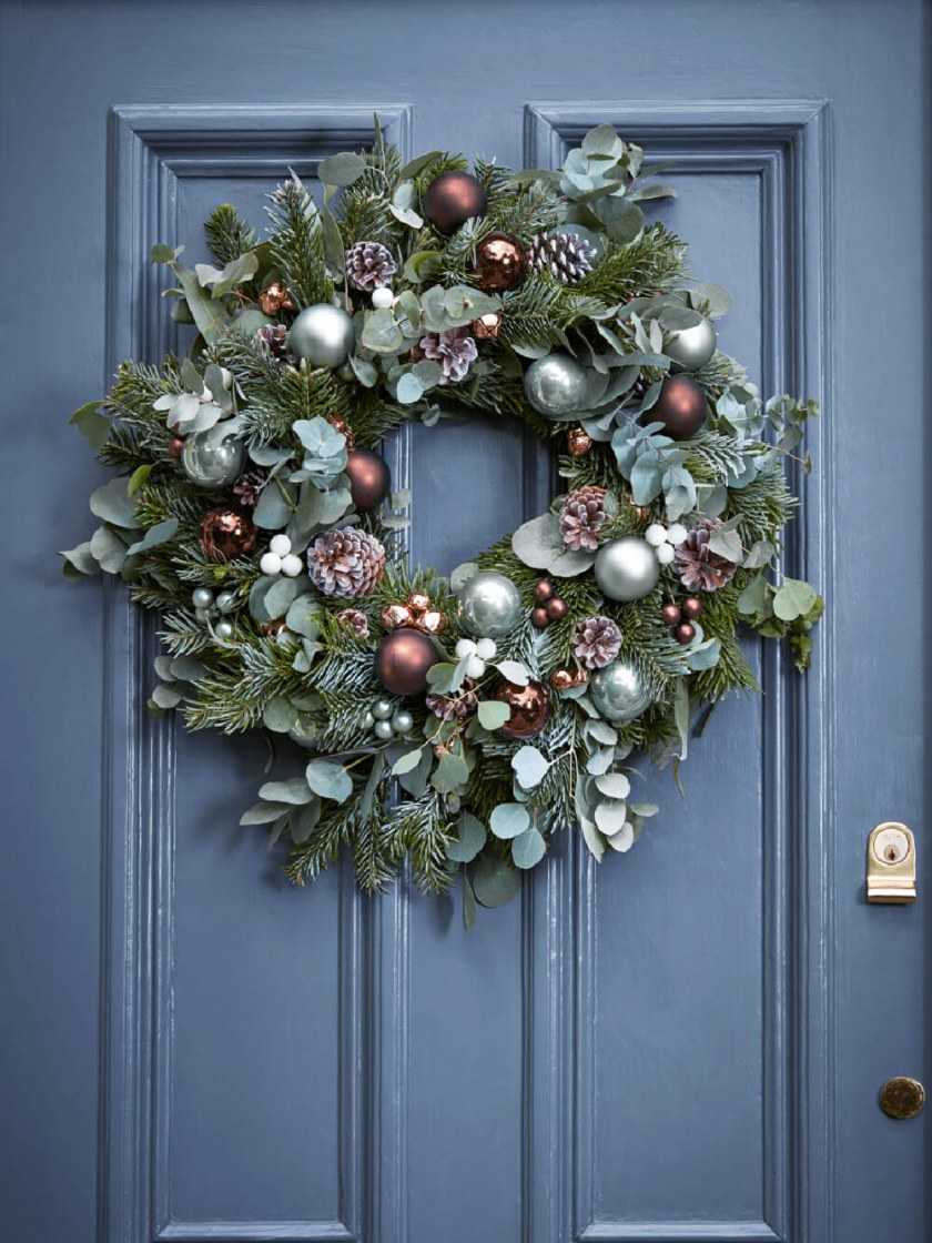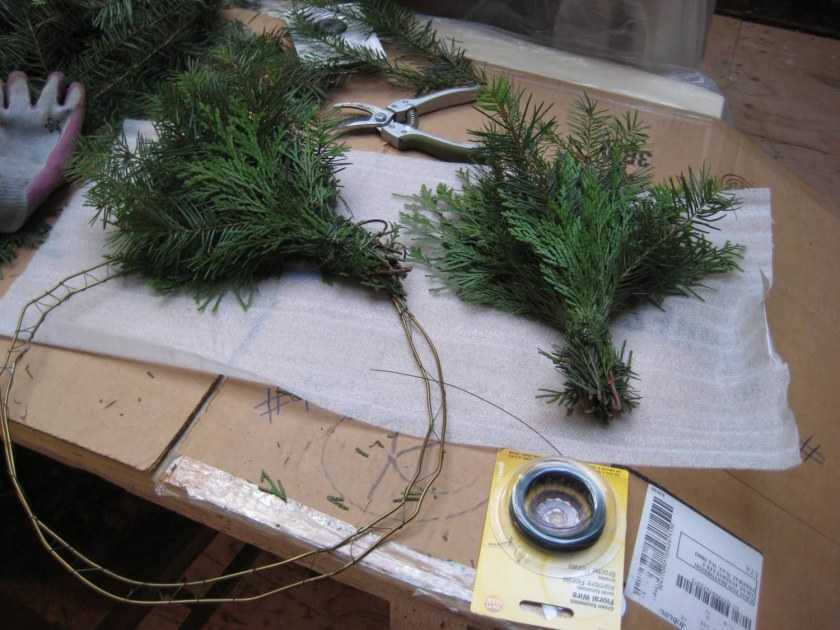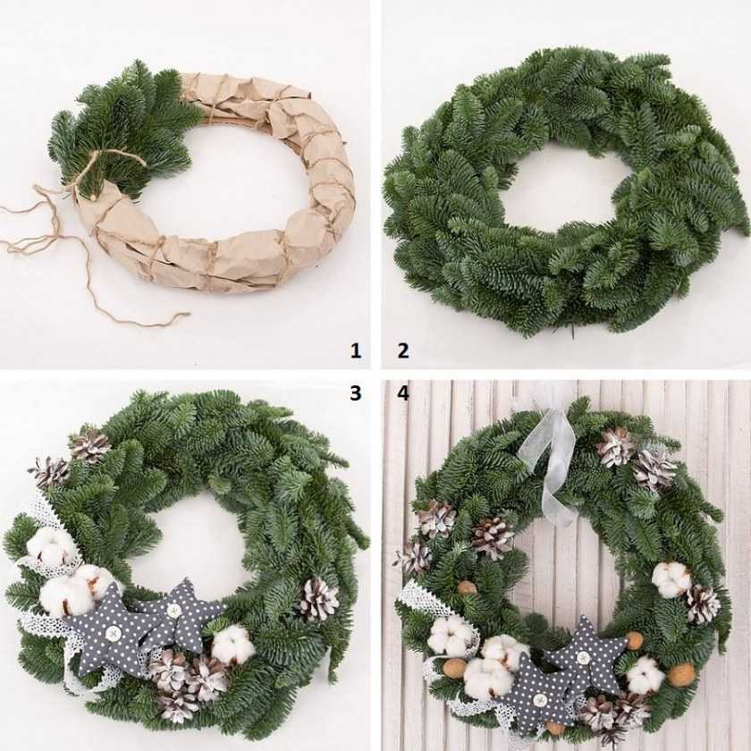 Такой обычай россияне переняли у своих западных соседей, которые обязательно украшают вход декоративно сплетенными ветвями хвойных деревьев. К получившемуся венку прилагают шишки, тесьму, бусы и бубенчики. Превосходная вариация — лапки собираются в пучки.