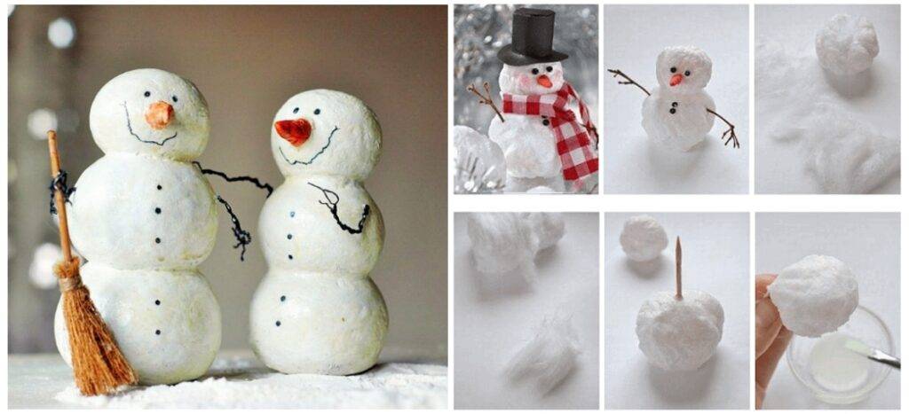 Чтобы снеговик из ваты был более плотным, нанесите на него клей ПВА и дайте высохнуть