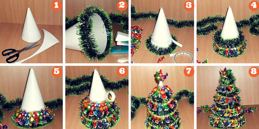 Сделанная своими руками маленькая елочка станет руками отличным подарком к Новому году, особенно, если это будет «сладкая» игрушка. Для этого конус-основа декорируется конфетами в яркой упаковке, золотой или красно-зеленой. Конфеты приклеиваются снизу вверх рядами. Между рядами можно проложить мишуру или гирлянду. Для взрослого под сладкой елкой может скрываться бутылка шампанского, если конфеты приклеить на бутылку.