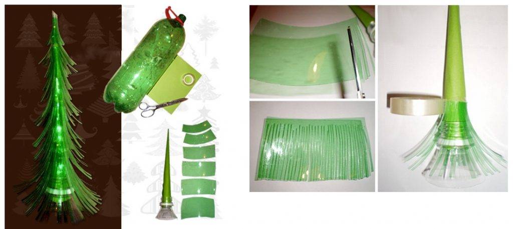 Очень интересную имитацию елочных иголок можно изготовить из пластиковой бутылки зеленого цвета. Для этого бутылка разрезается по спирали лентой шириной около 20 мм. Край ленты необходимо нарезать в виде бахромы, а затем полученную ленту можно закрепить на картонную основу самодельной елки.
