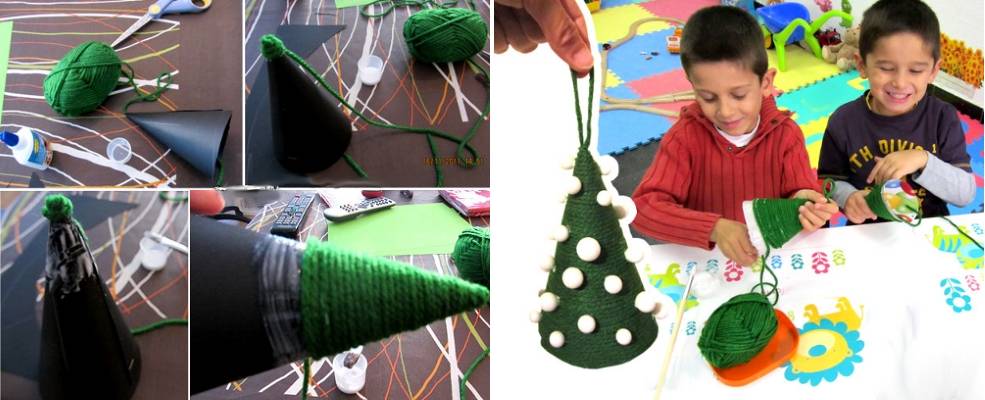 Картонную основу можно хаотично или спирально обмотать нитью для вязания (например, акриловой или шерстяной), оклеить цветной бумагой, обернуть тканью. Можно натянуть на картонную основу конус, связанный крючком из зеленой пряжи.