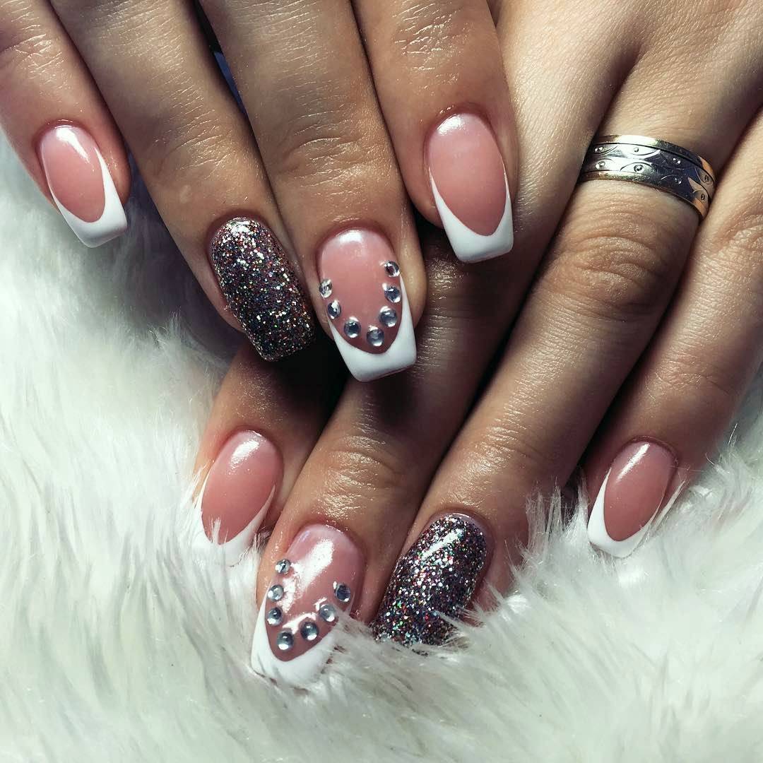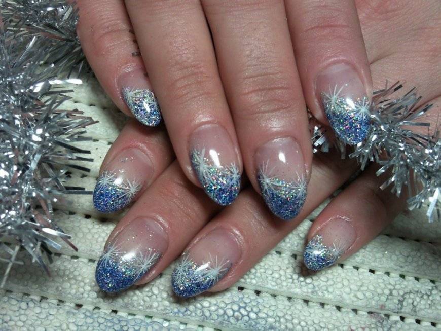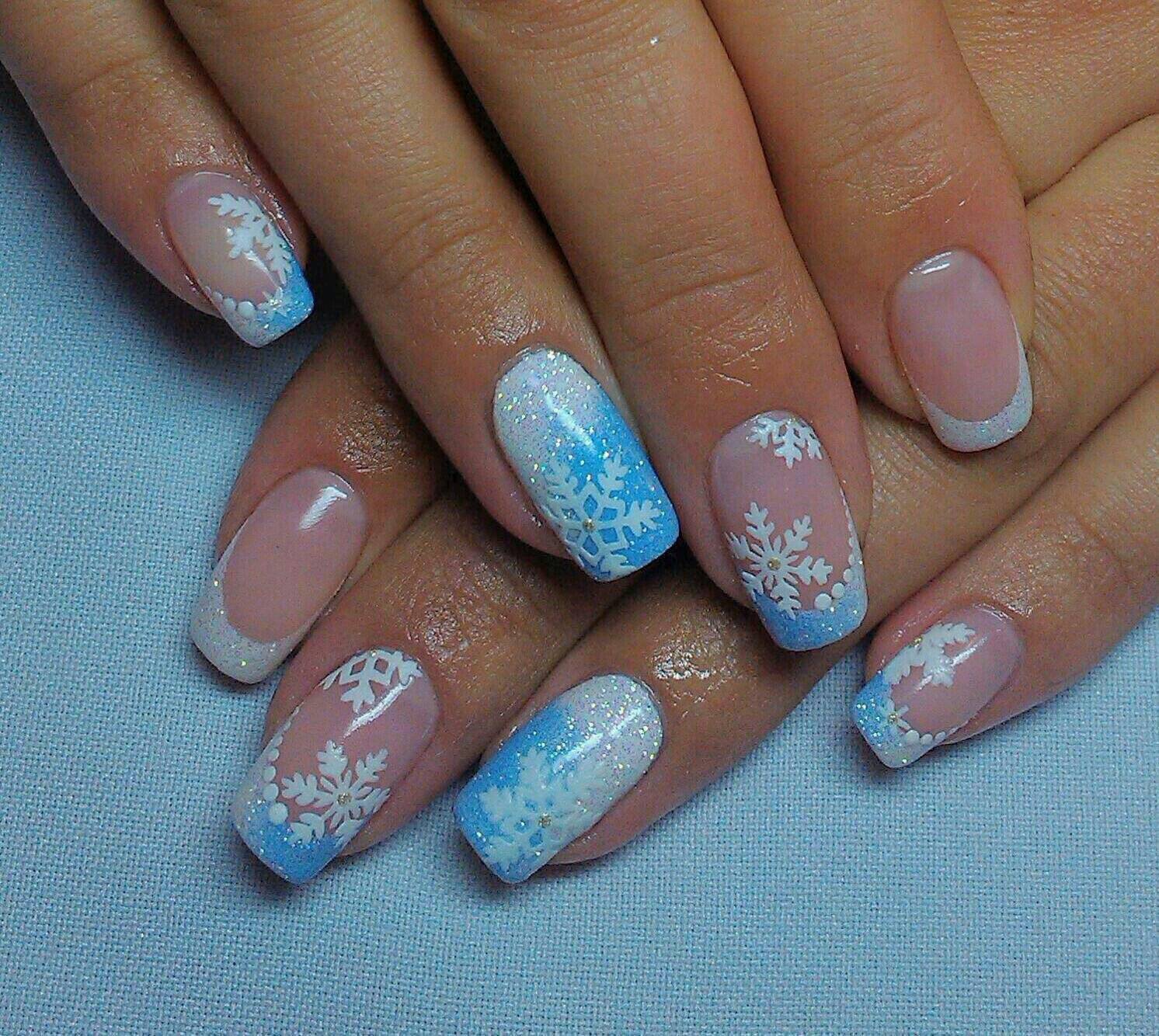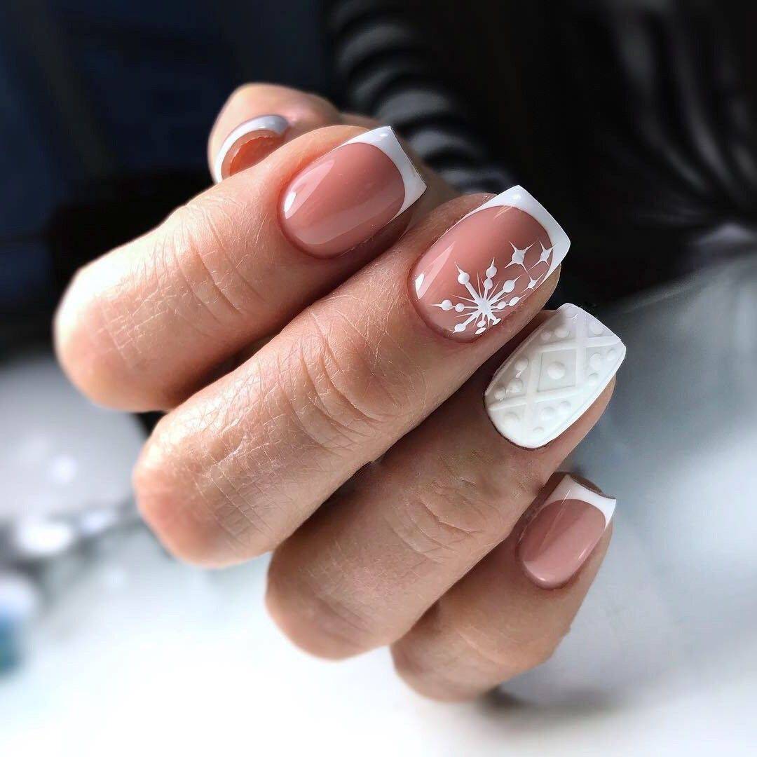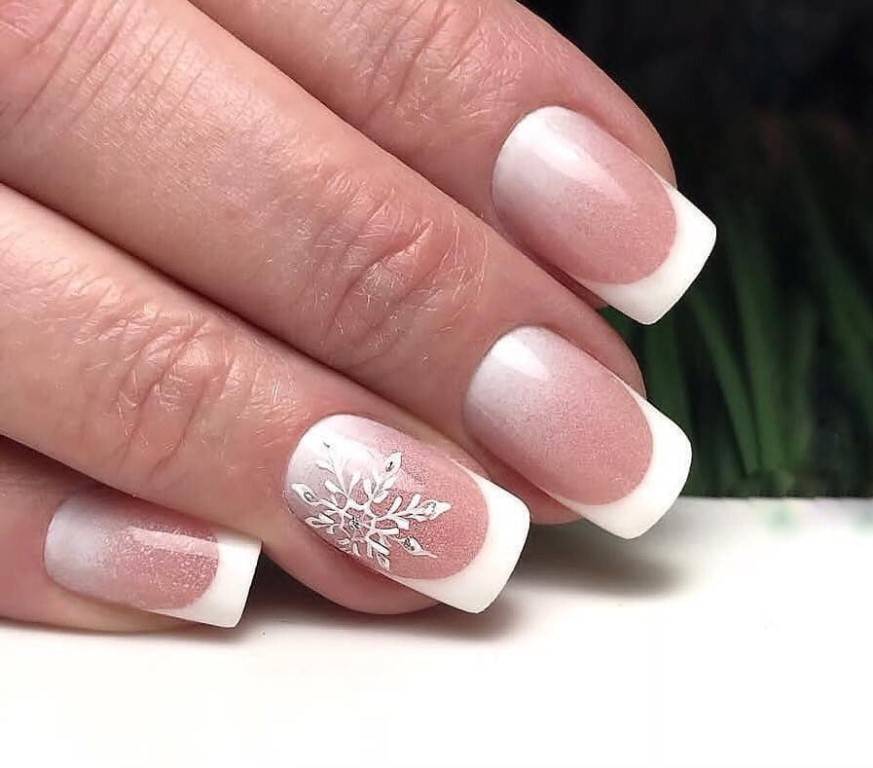 Нежно и модно смотрится классический белый нежный френч в сочетании с блестками и снежинками.