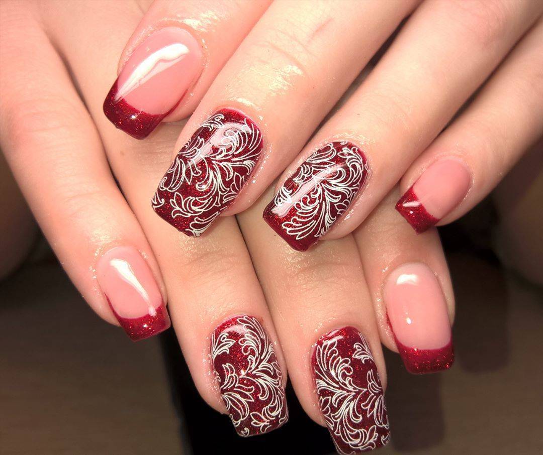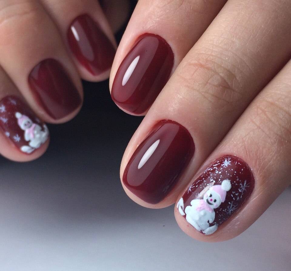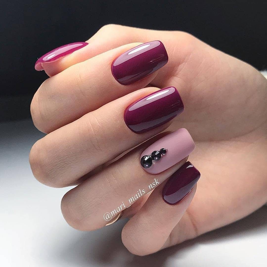 Если насыщенный красный цвет не для вас, то обратите внимание на бордовые тона. Такой дизайн великолепно смотрится в глянцевом и матовом оформлении со стразами и «золотыми» блестками