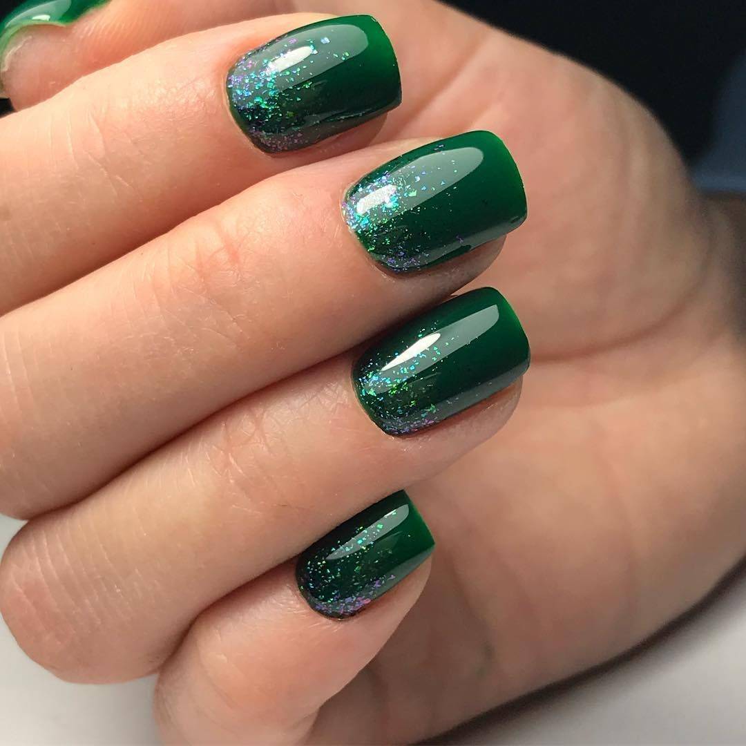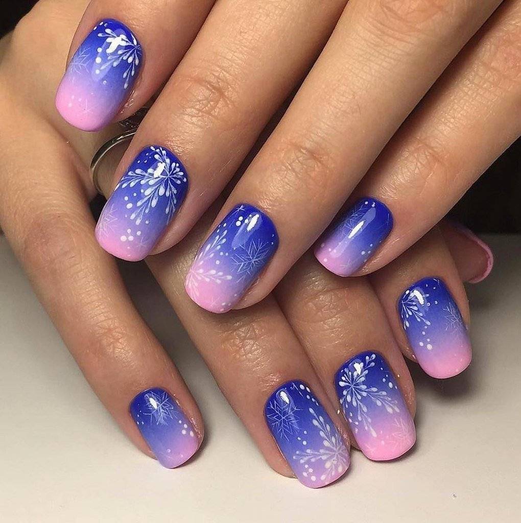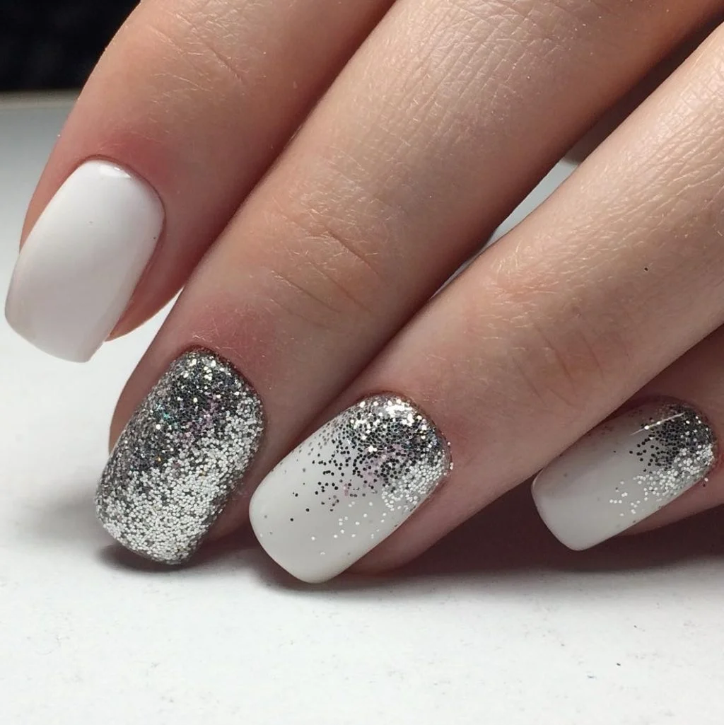 Если хочется красивых переходов на ноготках, то смело делайте градиент. Кроме того, в этом праздничном сезоне очень модно поверх цветного градиента, дополнительно делать легкую растяжку серебряными блестками. Это выглядит очень стильно и нарядно.