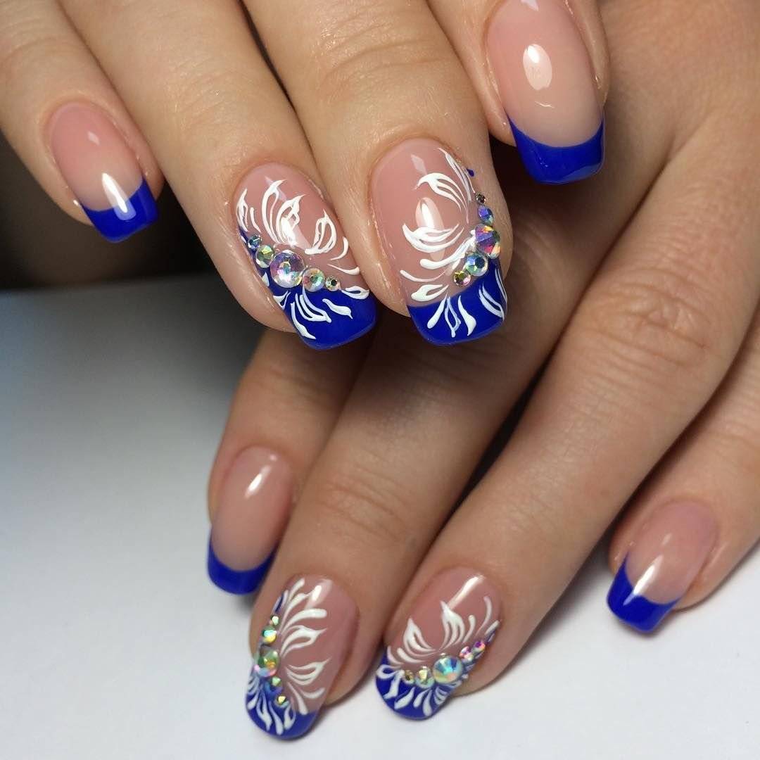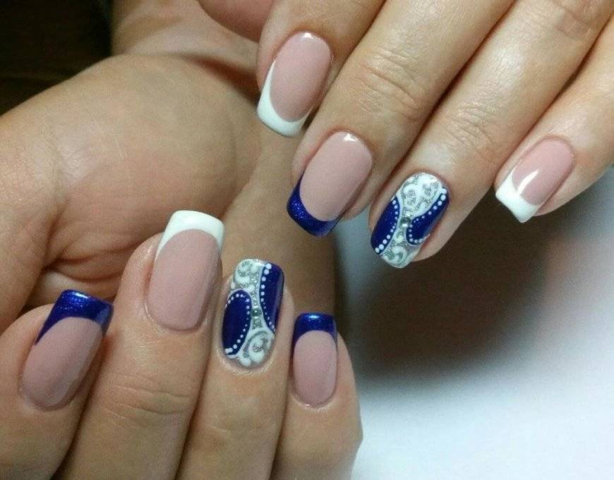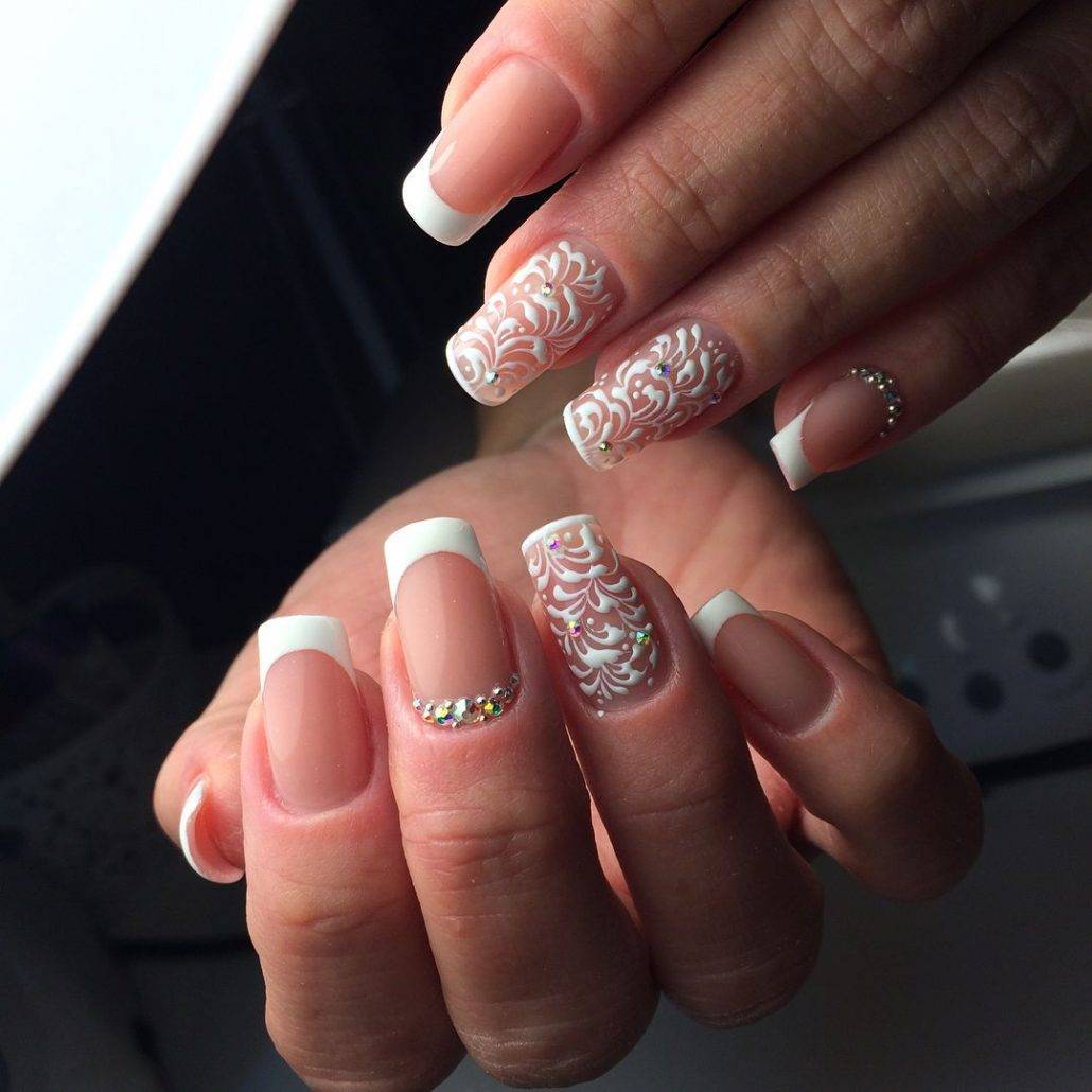 Изящно и нежно смотрится френч в сочетании с вензелями, блестками и стразами.
