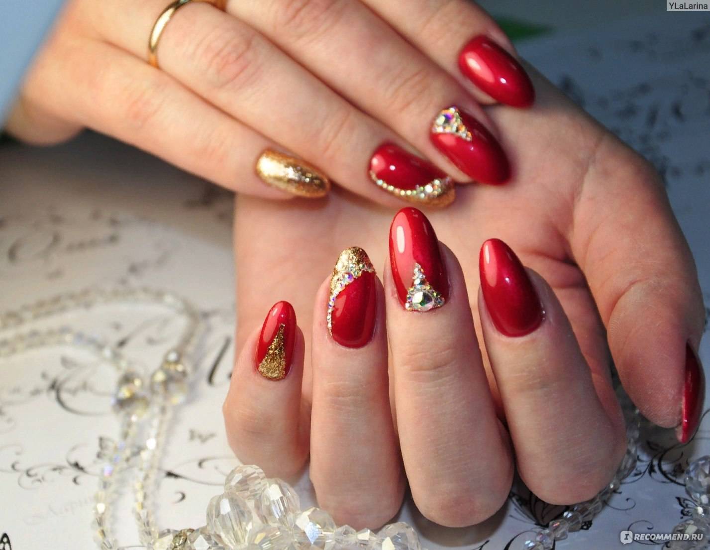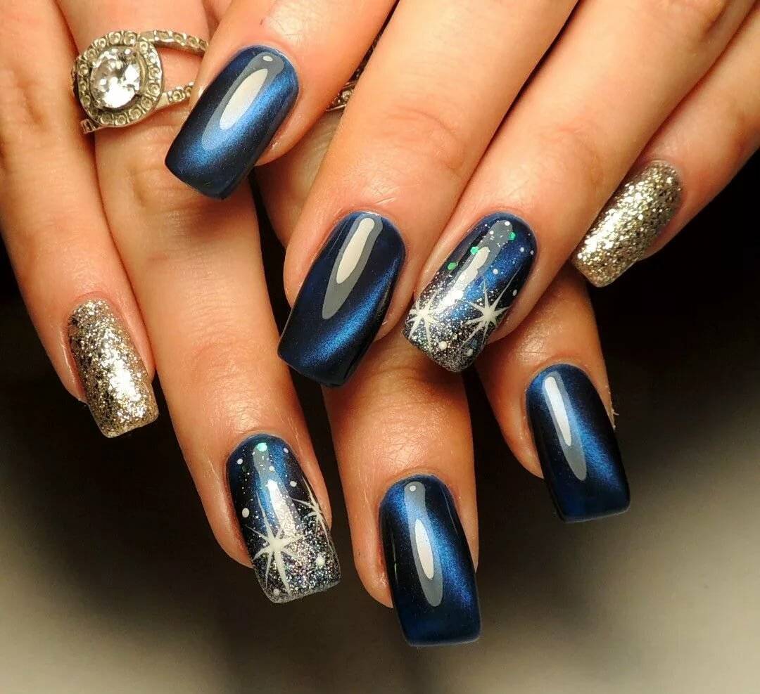 Для создания более яркого образа, стоит попробовать сочетание двух ярких цветов. Красиво на праздничном вечере будут выглядеть сочетания темно-синего с золотистым или красный с серебряным. По одному ногтю на руке можно декорировать стразами или интересным новогодним узором.