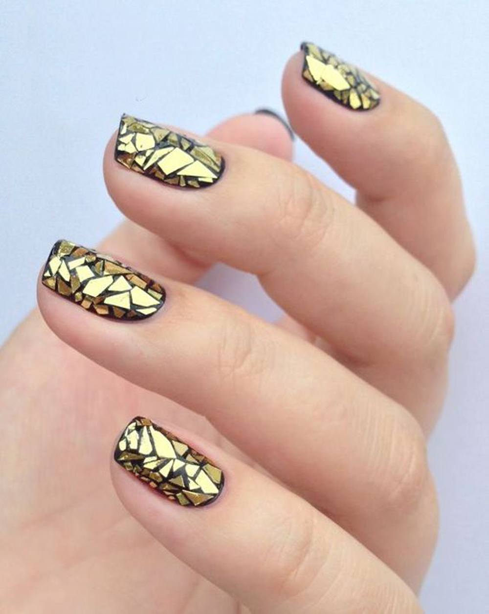 Фольга разных цветов очень стильно и нарядно будет смотреться в вашем Новогоднем дизайне. Ее можно сделать как самостоятельным дизайном, так и скомбинировать с френчем, мазками и брызгами краски, гелем «Паутинка» и любыми блестками.