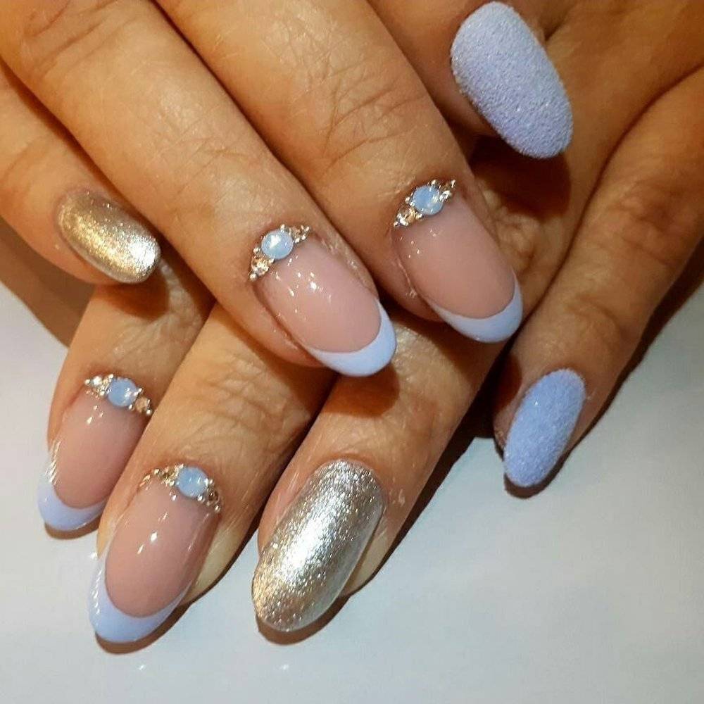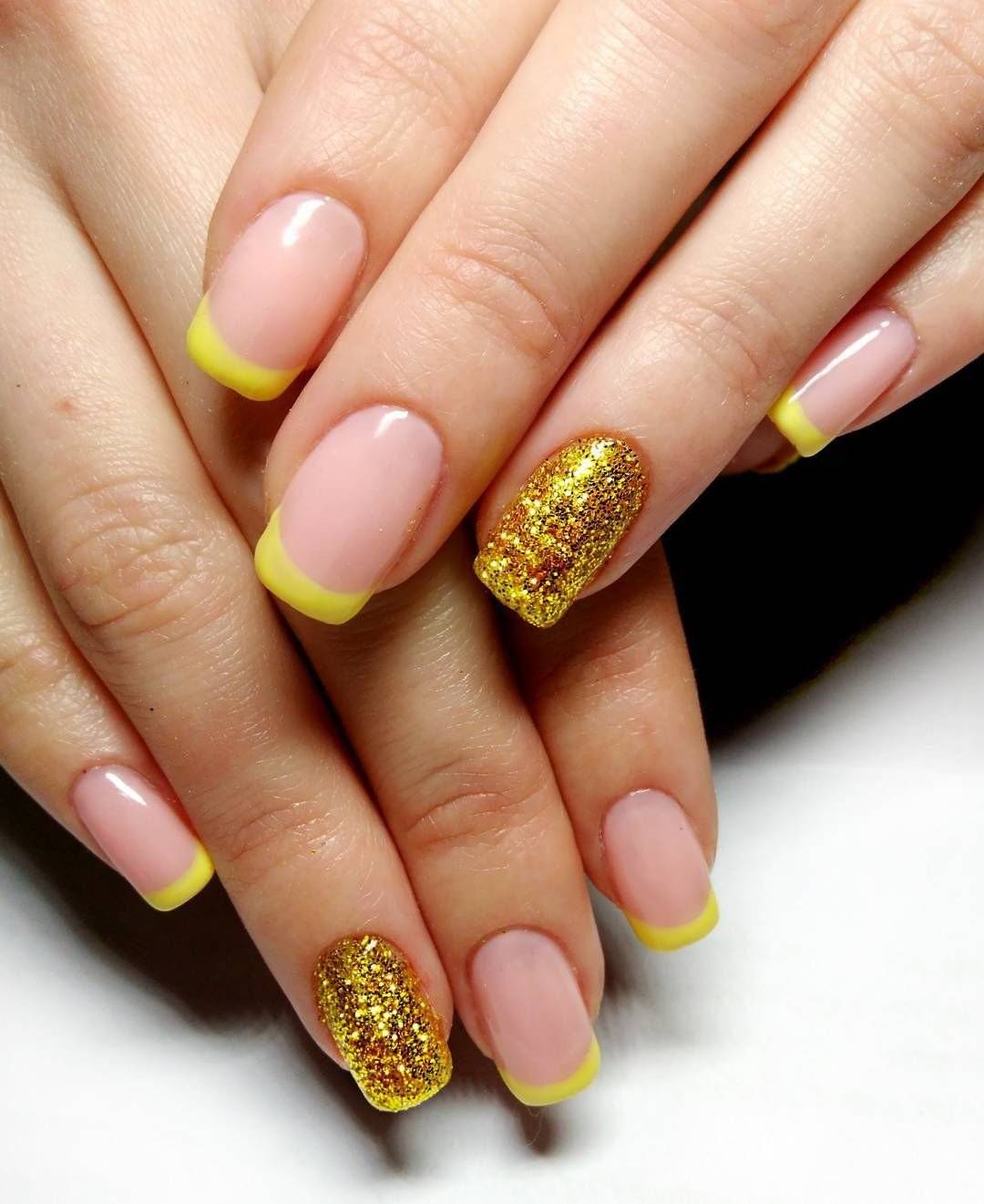 Красиво и стильно будет выглядеть золотой, серебристый, черный, голубой и красный френч в блестящем исполнении, или с добавлением блесток и страз.
