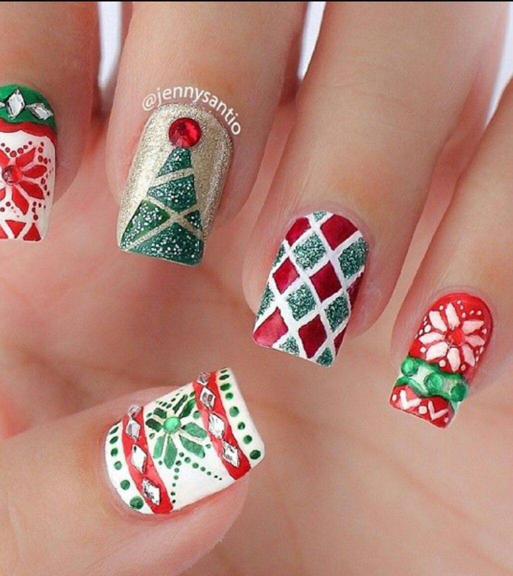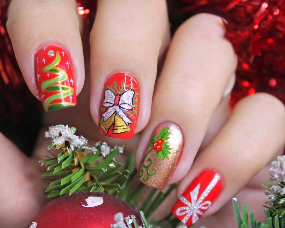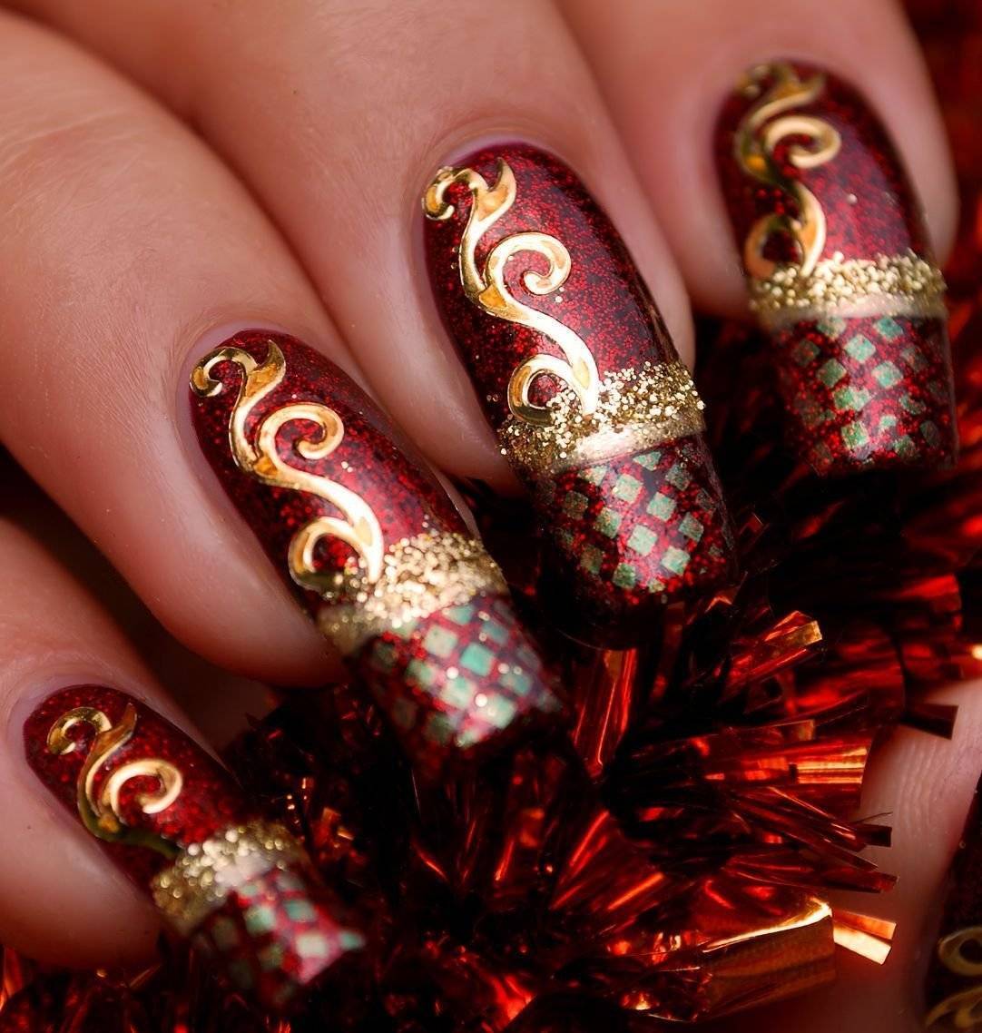 Используйте для праздничного нейл-арта украшения, на которые вы бы никогда не обратили внимание в повседневных буднях, украшайте ноготки яркими насыщенные цветами, которые будут переливаться в свете новогодних гирлянд и украшений
