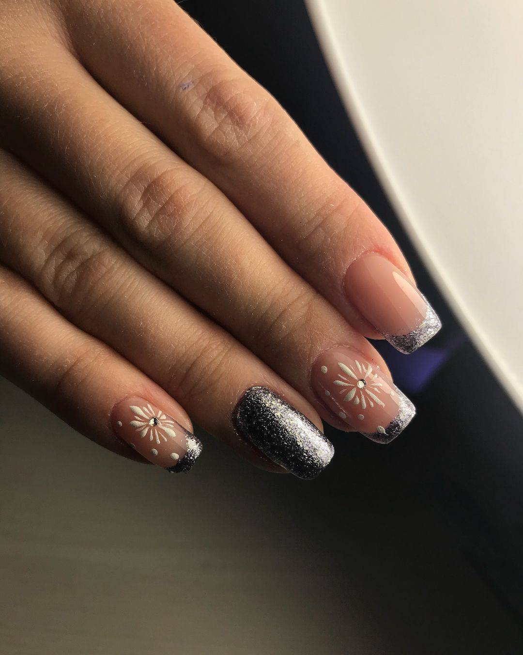 Если вы предпочитаете цветной французский маникюр, то для Нового года сочетайте зимние тона, например, молочный с голубым, кремовый с синим, чёрный с белым. Отличным дополнением станет добавление блёстков или шиммера.