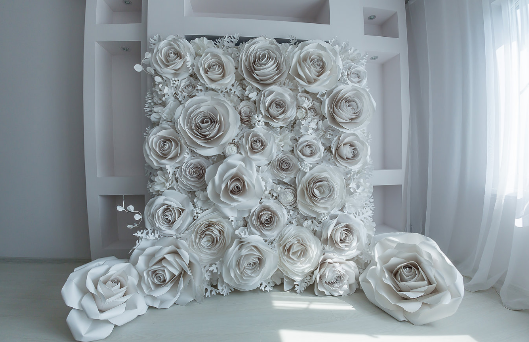 Чтобы сделать фотозону из бумажных цветов понадобится гофрированная или специальная бумага для рукоделия. Кроме роз, хризантем и ромашек, украшающих стойки и стены помещения, существуют не менее привлекательные варианты декоративных элементов.