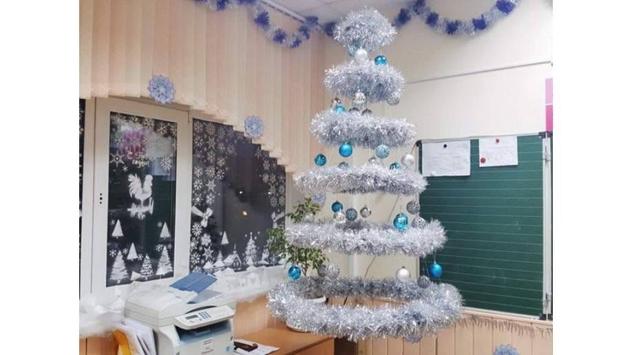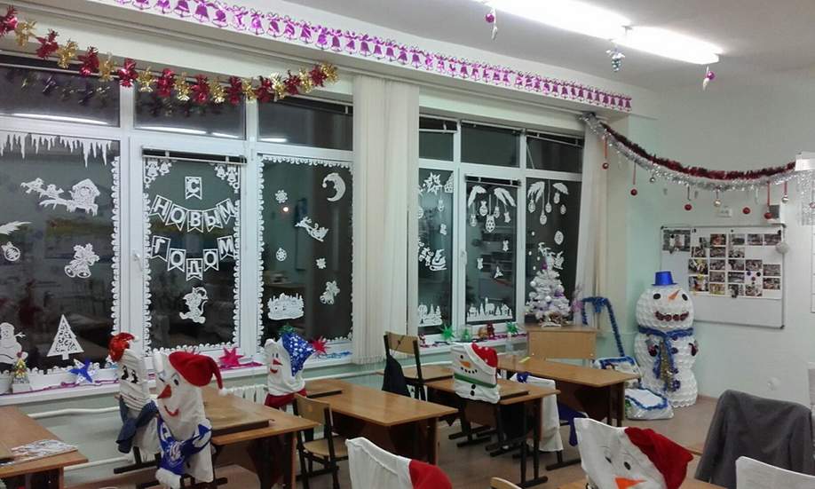 Самые большие поверхности, которые не заняты в учебном процессе — это окна, стены и потолок. Их можно украсить в новогодней тематике легкими конструкциями и композициями. Главное условие — они не должны быть слишком громоздкими и тяжелыми, чтобы обеспечить безопасность детей в классе.