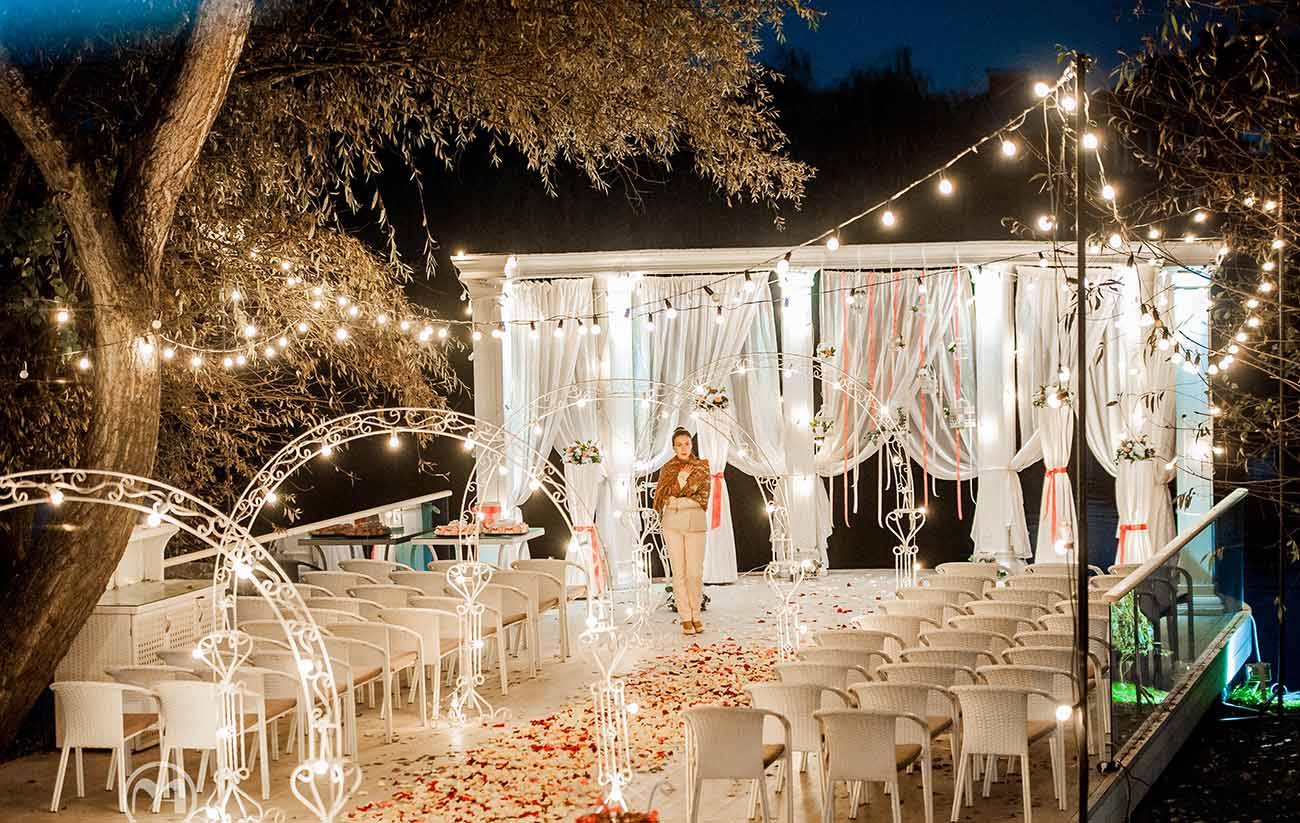 Большое количество огней, созданных при помощи гирлянд из лампочек придаст церемонии еще большей помпезности, сделав церемонию царской.