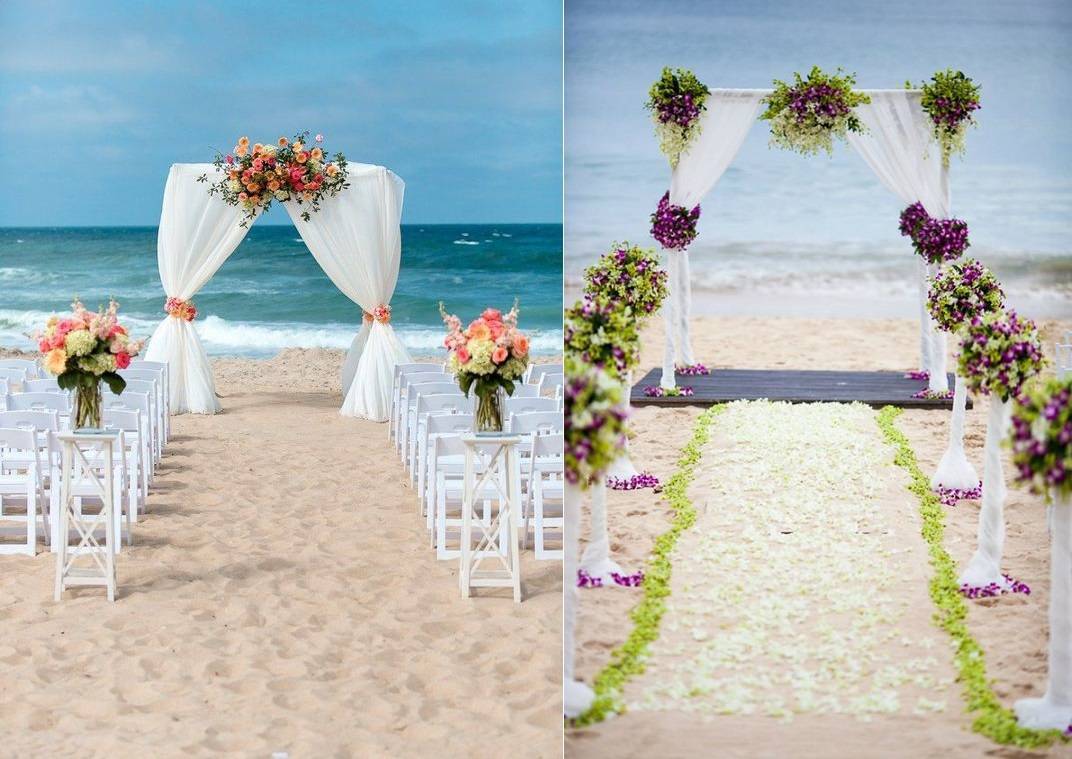 - Пляж. Очень романтичное место, на фоне плескаются волны, чувствуется морской бриз. Только песок не очень хорошая дорога для невесты, поэтому рекомендуется установить специальную площадку.