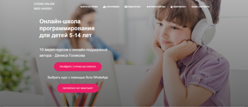 Codim.Online- авторская онлайн-школа программирования для школьников в возрасте 5-14 лет. Уроки проходят онлайн, программы 10 курсов разработаны специалистом высокого уровня Денисом Голиковым. Для каждого курса предусмотрено 2 или 3 бесплатных пробных урока. На занятиях по программированию изучаются основы языков: