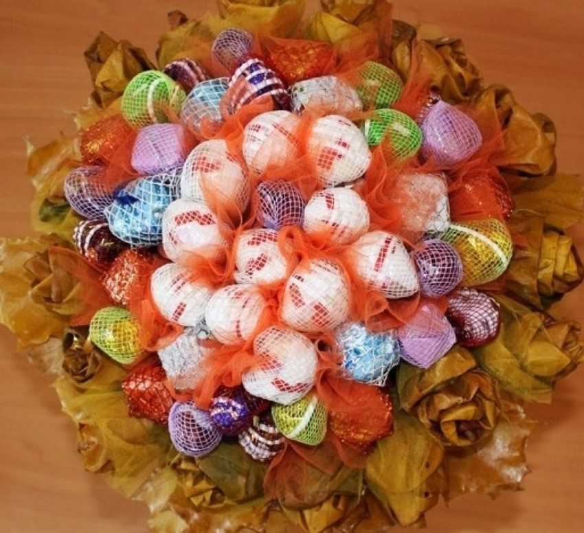 Самый популярный вариант – цветок ромашки. Именно его используют в своих букетах профессиональные декораторы. Посмотрите мастер-класс, как его сделать.