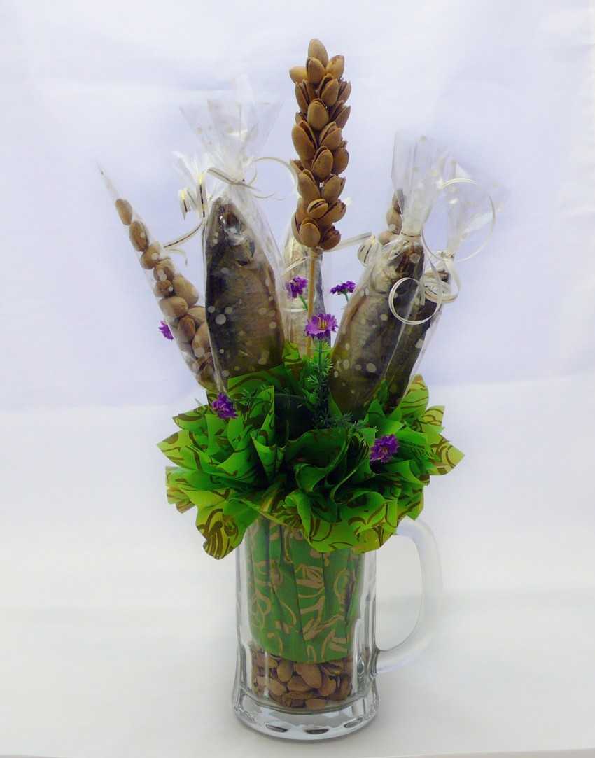 - Бусы соединяем в кольцо уже на букете, завязываем и отрезаем лишнее. Букет на подставке готов.