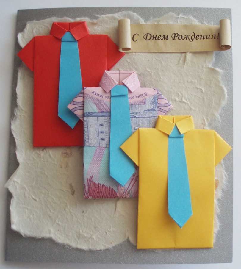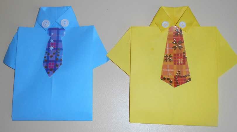 Есть еще одна занимательная идея как сделать из бумаги оригинальную открытку для папы: слова поздравления можно поместить внутри полноценной бумажной имитации рубашки. Справиться с созданием оригинальной задумки поможет пошаговая инструкция.