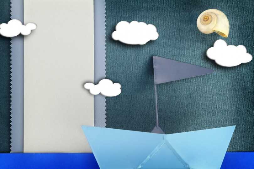 Основание кораблика – коричневая неравнобокая трапеция, у которой большее основание вверху, а более острый и приподнятый угол – справа. Левый парус – это треугольник любого яркого цвета с прямым углом внизу справа, нижняя сторона которого должна располагаться параллельно верхушке трапеции. Правый парус – прямоугольный треугольник, основание которого должно быть закругленным и быть направленным в правую сторону. Располагаться он тоже должен параллельно верху трапеции.