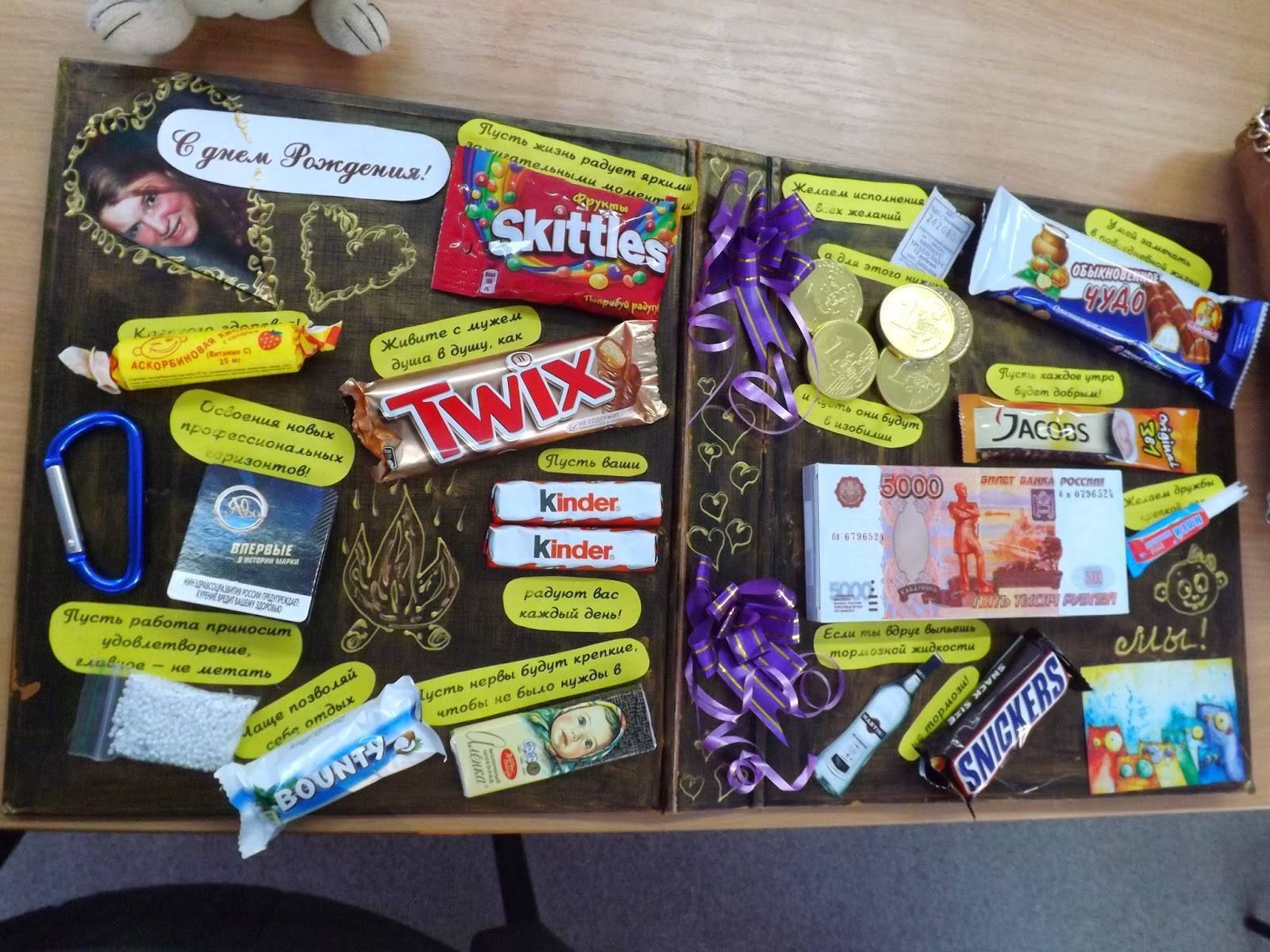 Подойдут не только батончики, но и разные конфетки с забавными названиями в красочных обёртках, леденцы, драже в упаковке и даже пакетики кофе!