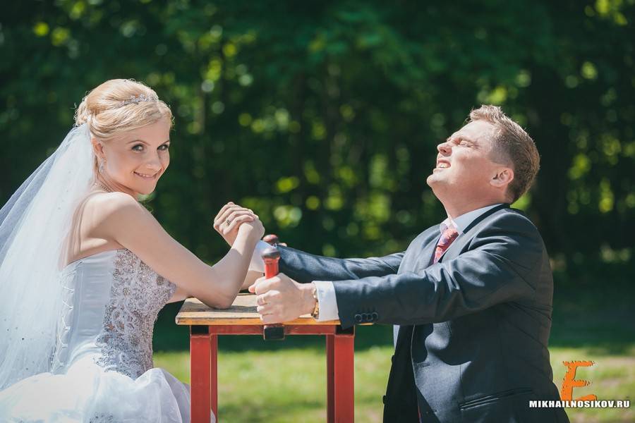 Фотосессия с юмором. Многие предпочитают внести нотку юмора в процесс фотосессии. Это может быть основная тема или же просто небольшое веселое дополнение к романтичной идее. Чтобы сделать снимки жениха и невесты веселыми, можно использовать большие леденцы, шары, плакаты с различными надписями, смешные очки, усы и т.д. Довольно популярна идея с мнимым принуждением жениха к свадьбе. Если эта идея вам неприятна, просто повеселитесь, а фотограф заснимет ваши счастливые улыбки.