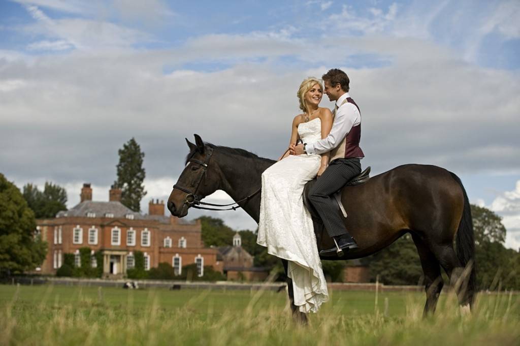 Фотосессия с лошадьми. Это не самая дешевая фотосессия, учитывая, что надо где-то взять лошадей и научиться не бояться и не пугать их. Не обязательно сажать невесту или жениха на скакуна. Отличные снимки получатся, если молодые будут просто стоять и целоваться рядом с лошадью, вести вдвоем ее под уздцы.