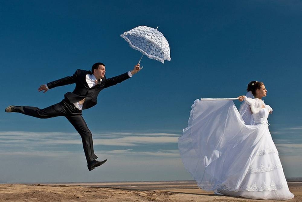 Хорошо, если съемка в прыжке проходит на траве и без обуви. Однако зеленый сок может подпортить платье. Прыгать можно как жениху с невестой, так и друзьям.