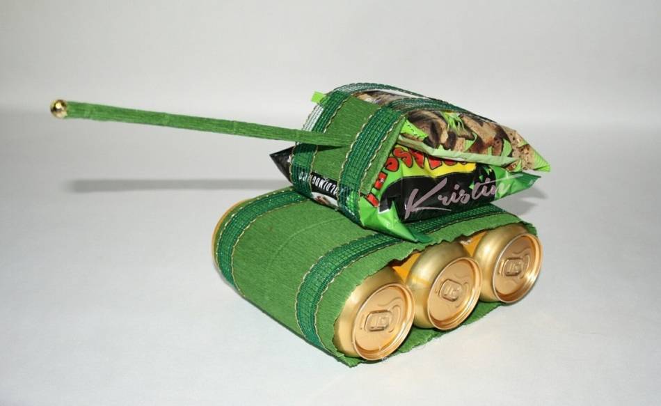 - Самый простой вариант — это самостоятельно сделать несложные букеты из пива и закусок. Хорошо себя зарекомендовали различные подарки военной тематики. Их можно создать из носков и трусов. Из таких предметов белья можно сделать танки, самолеты.