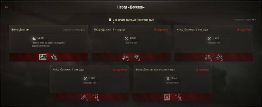 «Десятка—танковый набор с уже привычной механикой выбора определённых наград (2 из 6) + гарантированные награды пакета. О системе выбора и полном составе читайте в нашей статье чуть ниже.20 наборАвгуста месяцане содержит никакой привязки к нации. Набор уже доступен для всех игроков World of Tanks без исключений!