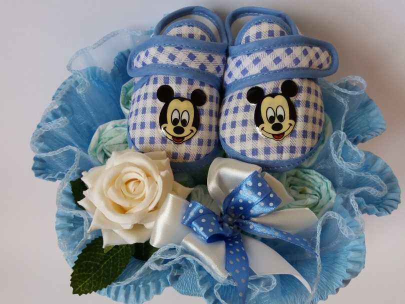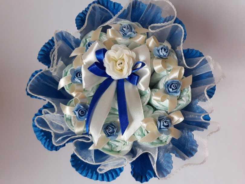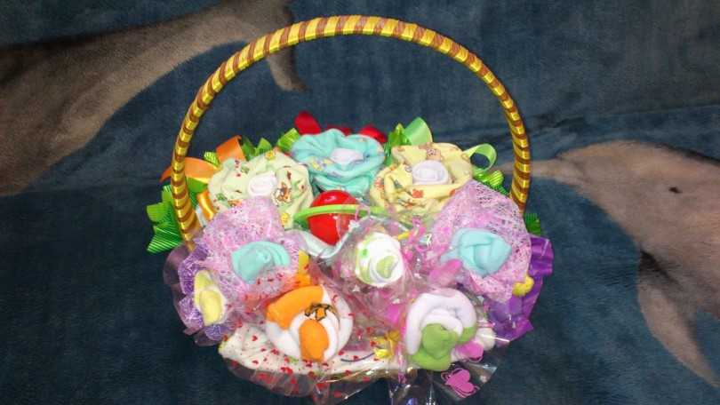 Они добавят красок и сделают букет живым. Не используйте в композиции живые растения. Это может вызвать у ребёнка или его мамы аллергию.Собранные вместе «цветочки» оформляют в красочную обёртку и украшают бантом из атласной ленты. В соответствии с полом младенца — композиции выполняют в определённой гамме.