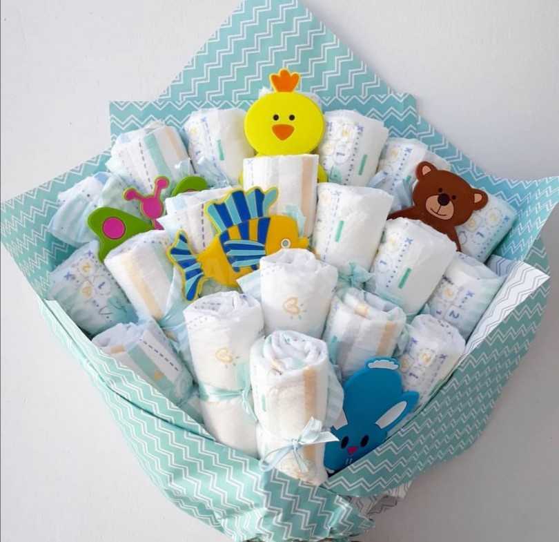 Кроме многослойных десертов, все «нужности» и одежда с легкостью складываются в форме велосипеда, улитки или корзины, а букет из памперсов способен удивить и приятно порадовать молодую мамочку.