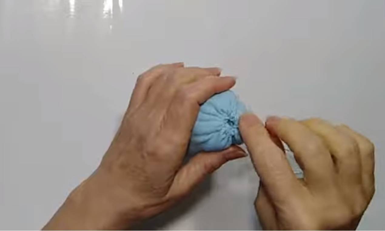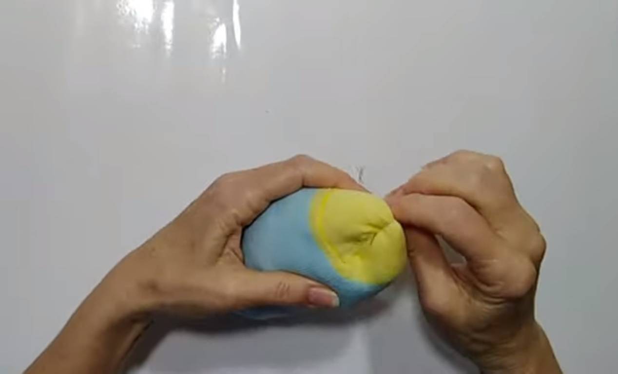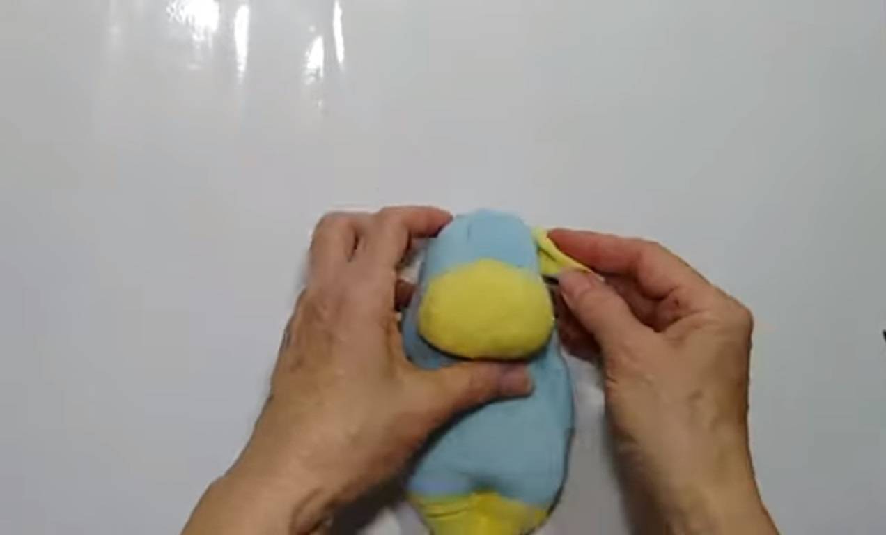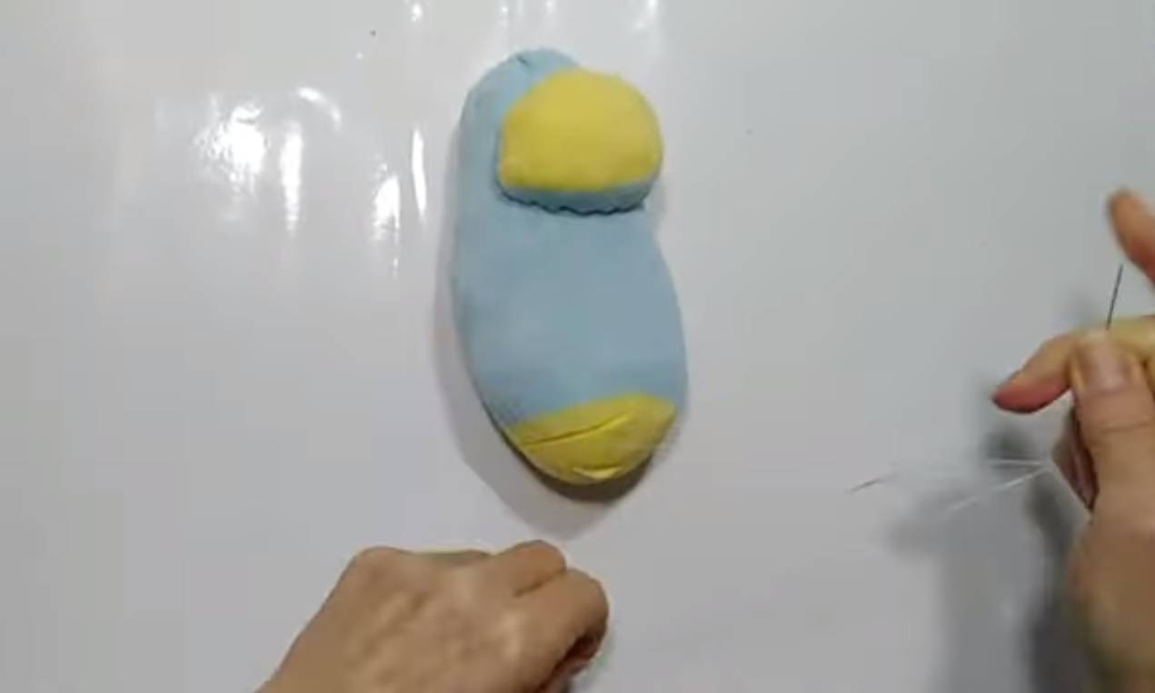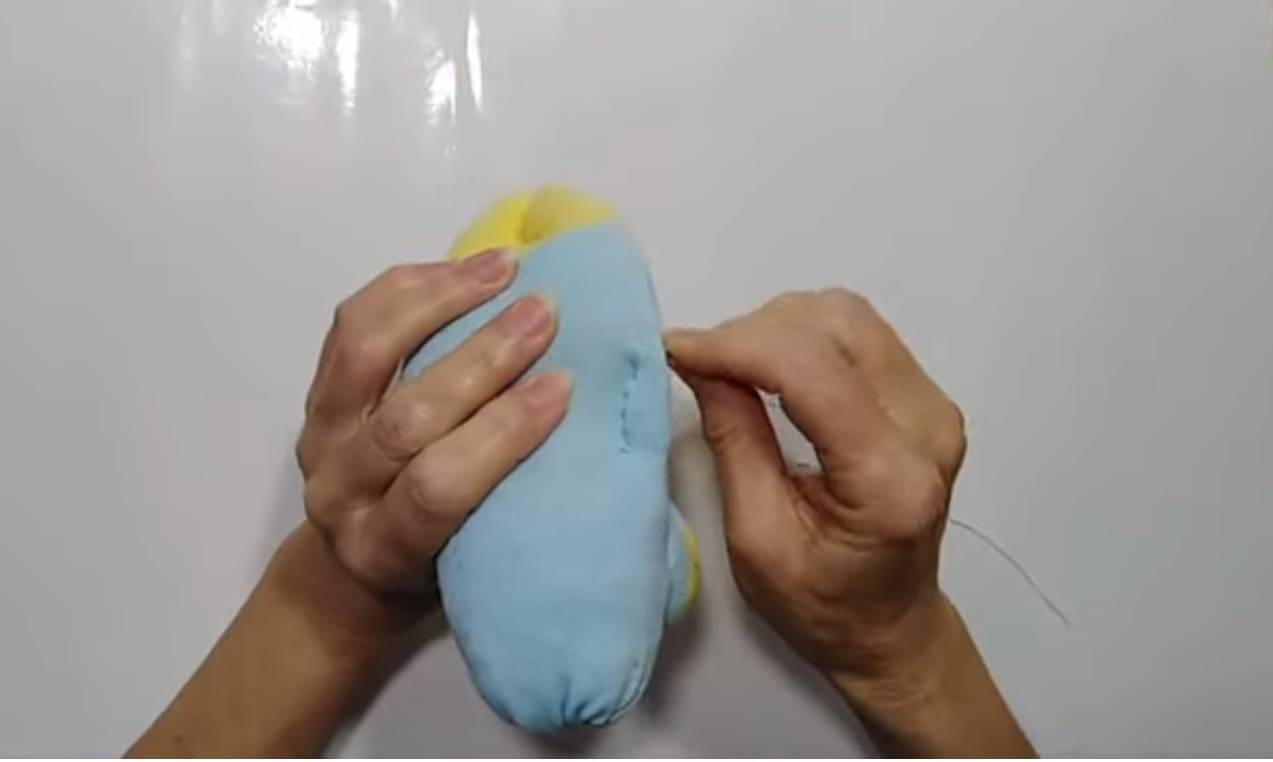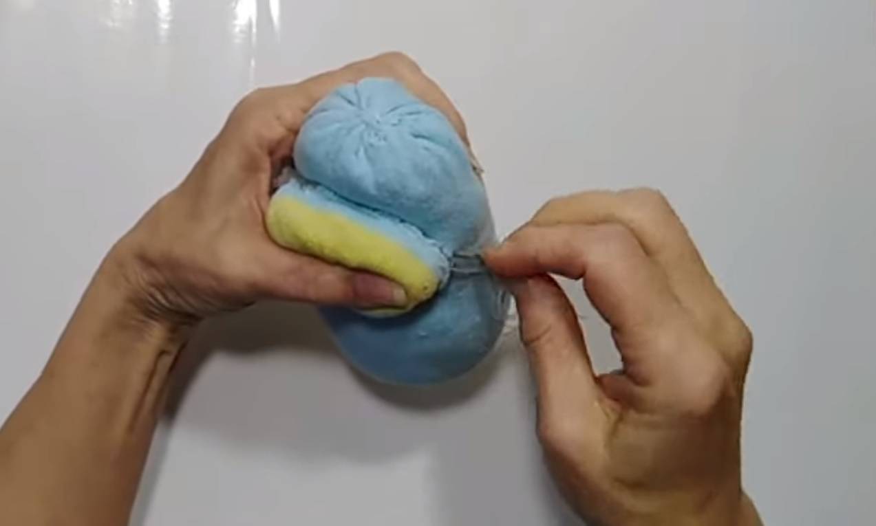 - Сделайте носик из маленького кружка: стяните нить, набейте синтепоном и пришейте носик к большому кружку.