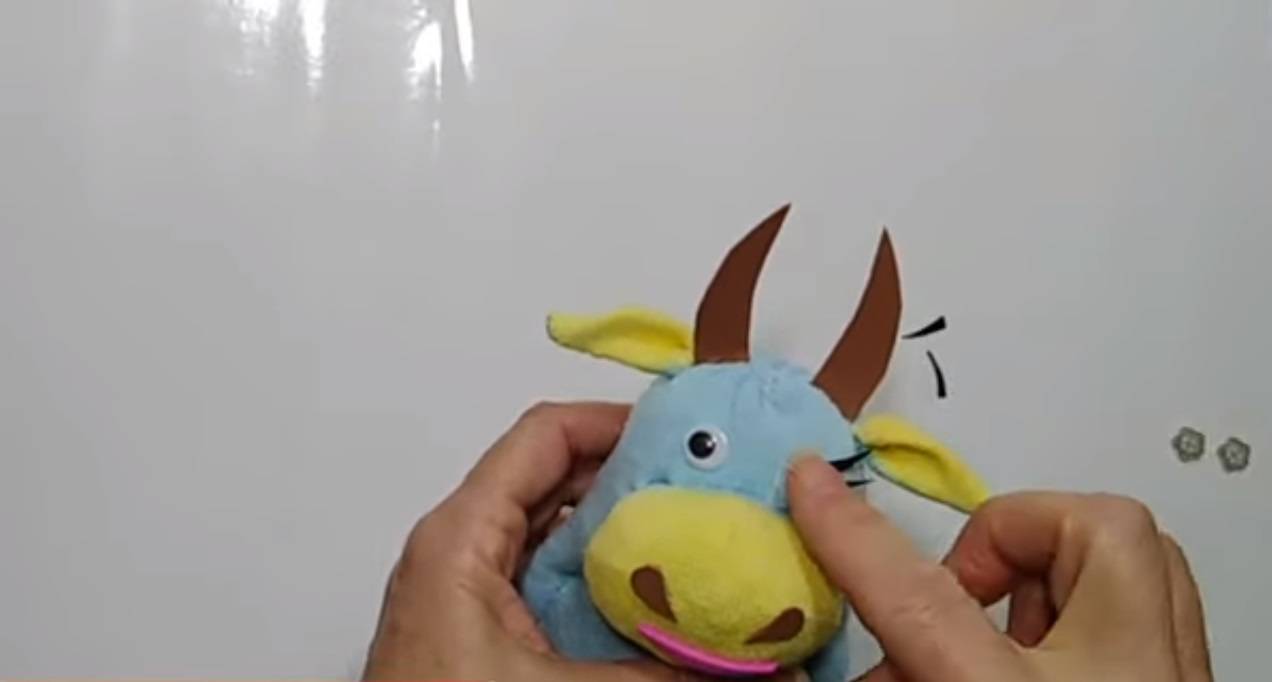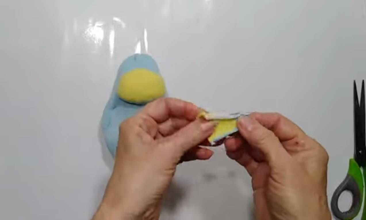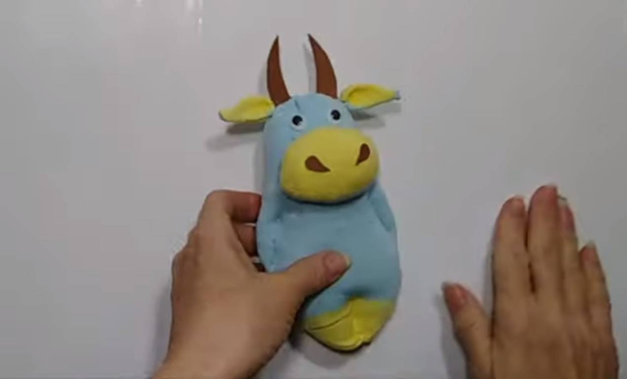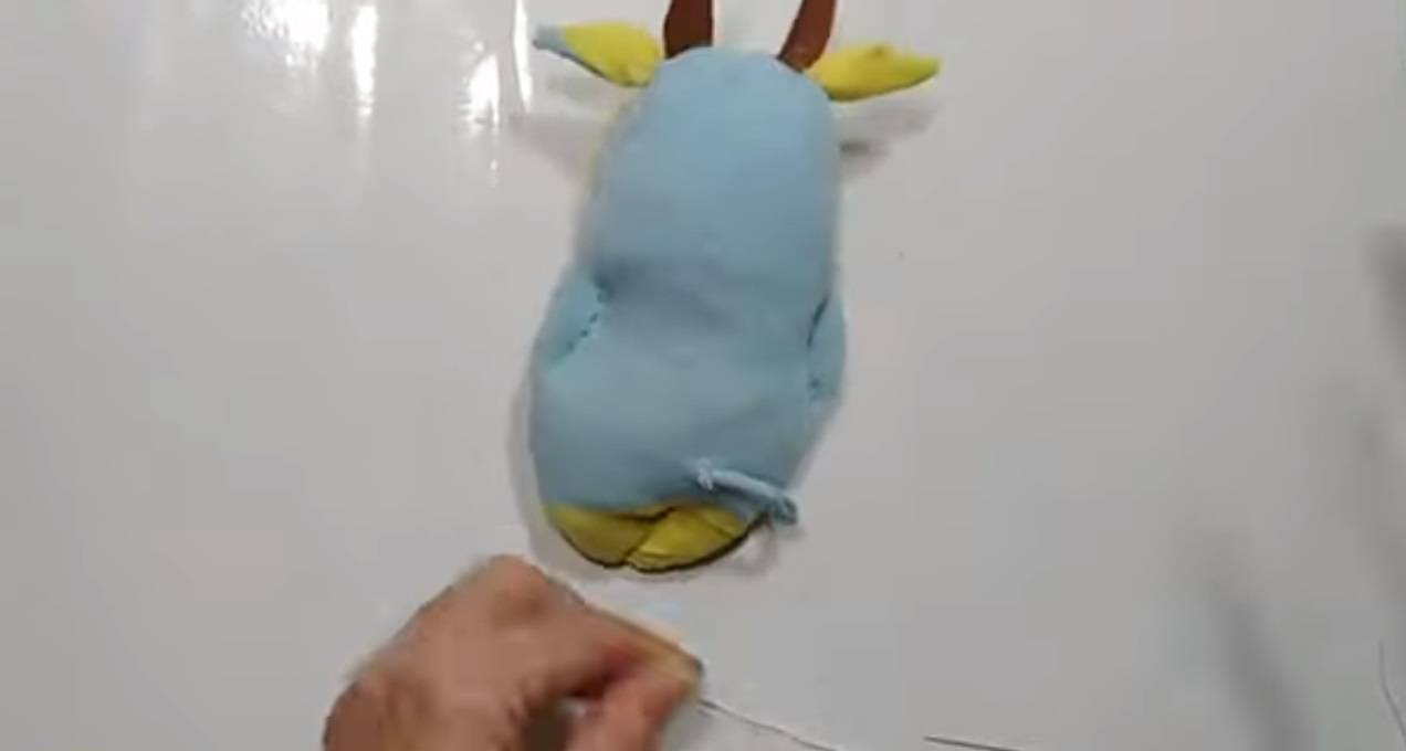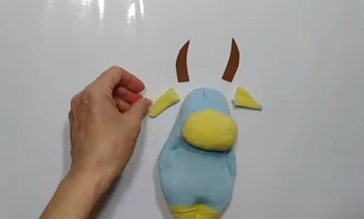 - Пришейте лицо к тельцу из тонкого фетра. Стоит отметить, что во время пришивания нужно добавить немного синтепона для объёма.