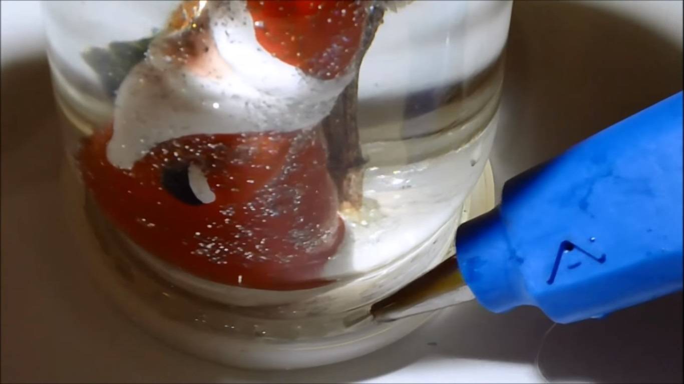 Шаг 2: Наполнить банку водой с глицерином в равных пропорциях. Добавить в полученную смесь блестки и хорошо перемешать.