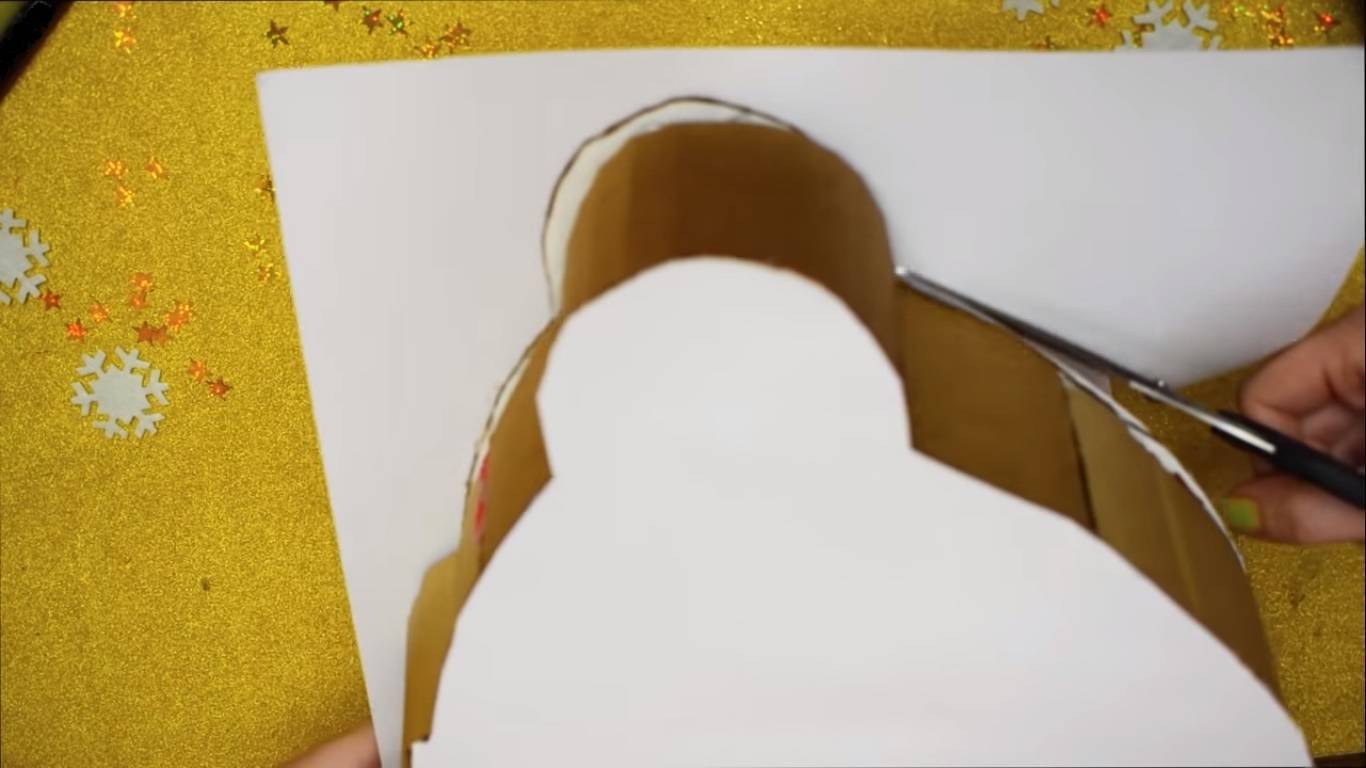 - Оберните золотой бумагой (лишь слегка, ее должно быть видно немного спереди и немного сзади), а затем красной.